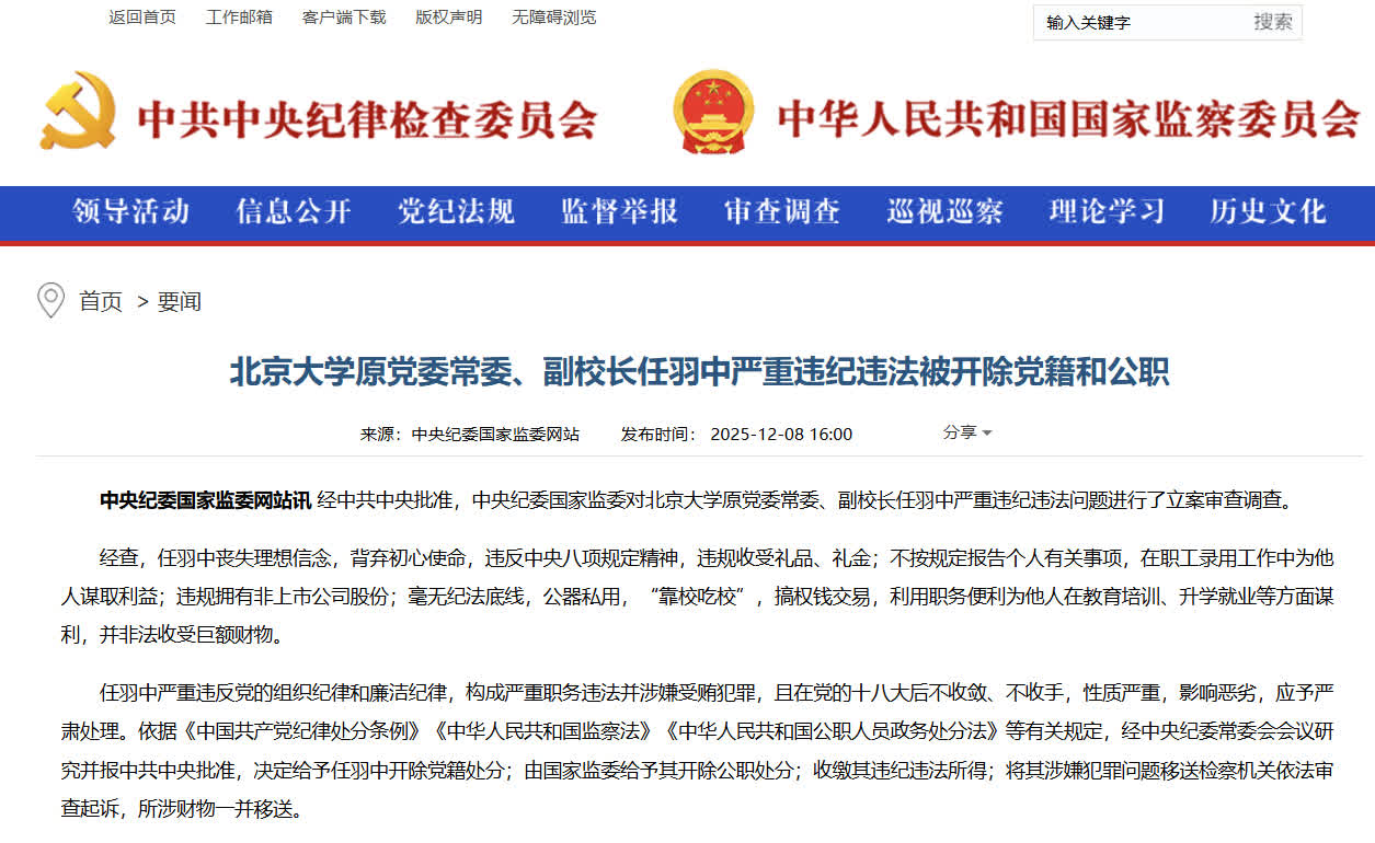 據中央紀委國家監委網站消息,經中共中央批准,中央紀委國家監委對北京大學原黨委常委、副校長任羽中嚴重違紀違法問題進行了立案審查調查。