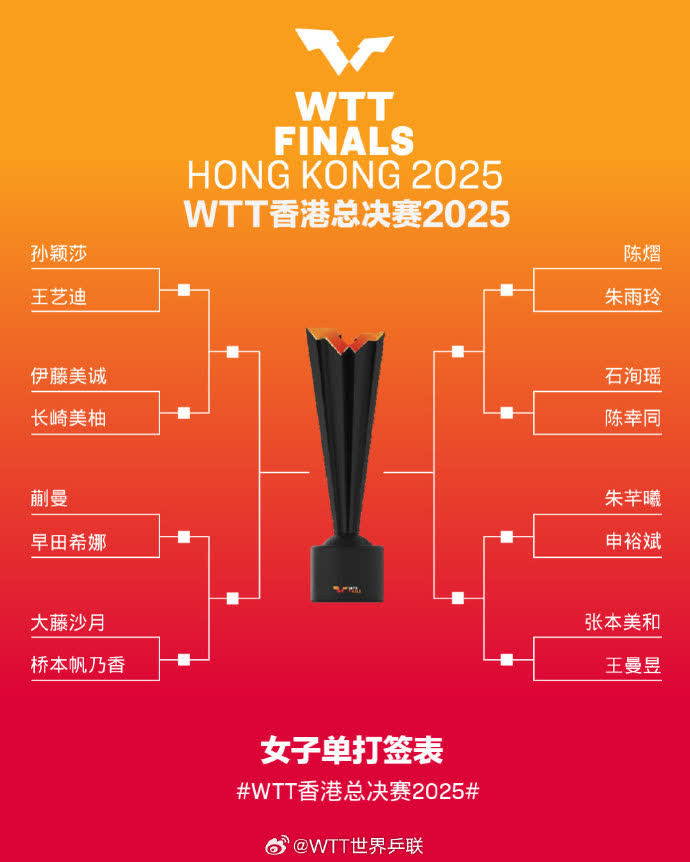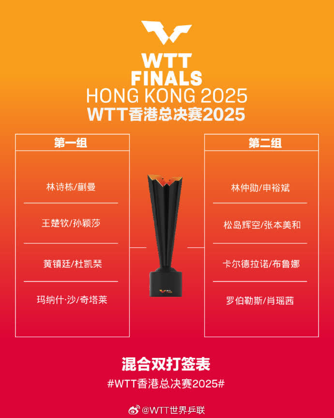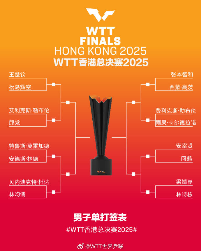12月8日,WTT香港總決賽抽籤儀式進行。從抽籤結果來看,男子單打方面王楚欽獨自鎮守上半區,下半區林詩棟和梁靖崑首輪比賽遭遇。女單孫穎莎首輪將戰王藝迪,王曼昱將再戰張本美和。混雙方面,「莎頭」組合同林詩棟/蒯曼分到了同一組。WTT香港總決賽將於12月10日到14日進行。