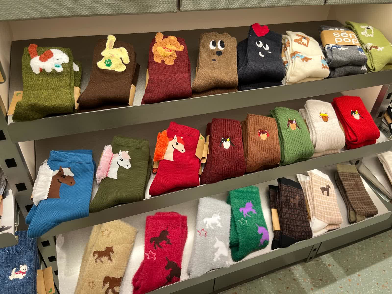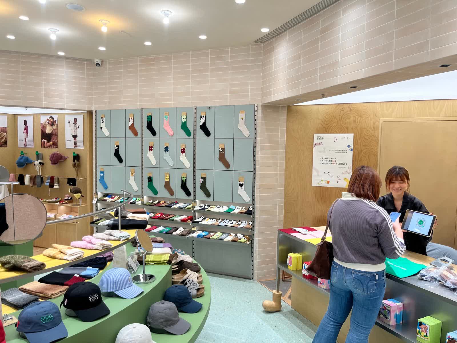 由於該店是寵物友善店,門外兩邊有放雨傘及狗狗休息區的位置;整個店舖裝潢以綠色為主,如同韓風Ig小店,充滿治癒系元素,隨手拍也非常出片。貨品方面,品牌售賣襪子、冷帽、披肩、耳罩等不同實用穿搭配飾,超萌動物系列襪子賣¥59;有5隻色選擇的圍巾披肩帽子由羊羔毛製,超保暖,僅賣¥239。據知周末、假期等日子也有不少港客捧場。