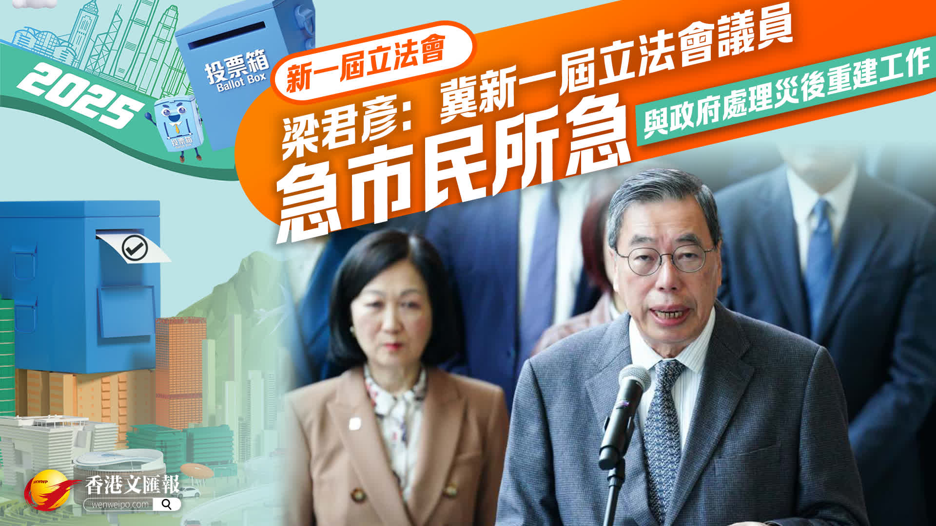 梁君彥表示,每個選區及界別都有良性競爭,拚能力、拚政綱,體現了一場民主選舉。來自不同專業、地區背景的議員,帶着中央的期望進入議會,議員須展現決心和魄力,急市民所急,全心與政府處理災後重建工作,包括修訂法例,撥款,及必要性改革等,令香港更安全,市民更安心。
