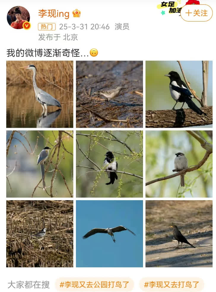 今年3月,有多位網友在北京公園裏,偶遇背着專業設備打入大爺攝影團的李現。雖然他包裹嚴實,還是被網友認了出來。有網友調侃,「李現設備不如大爺的。」隨後李現曬出多張鳥的照片。