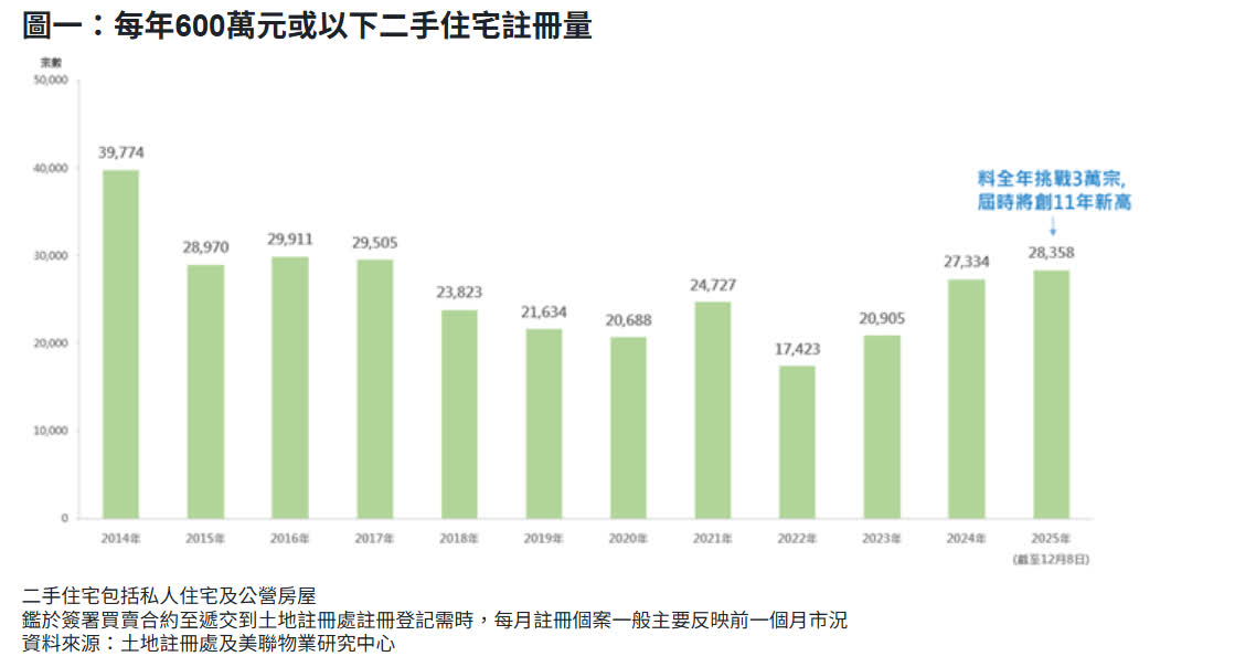 香港文匯報訊 受惠銀行按息向下及租金高企的環境,香港中細價單位交投趨旺。美聯物業研究中心綜合土地註冊處資料顯示,今年600萬元或以下二手住宅註冊量共錄28,358宗,已超越2024年同類銀碼的27,334宗,已屬8年年度新高水平。該行按目前走勢推算,估計今年全年600萬元或以下二手住宅註冊量將挑戰3萬宗水平,屆時將為2014年後的11年新高(見圖一)。