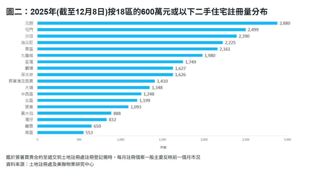 若以全港18區劃分,2025年(截至12月8日)600萬元或以下的二手住宅註冊個案中,最多的3區悉數來自新界。其中,元朗區全年錄得2,880宗600萬元或以下註冊,位列全港首位;屯門區則以2,499宗緊隨其後,排第二位;沙田區錄得2,390宗,位列第三。至於同樣超過2,000宗的地區,包括排第四位的油尖旺區,該區錄2,225宗600萬元或以下的二手註冊個案,並成為九龍區相關價位宗數最多的地區;第五位屬港島東區,年內錄2,161宗,為港島區最多。
