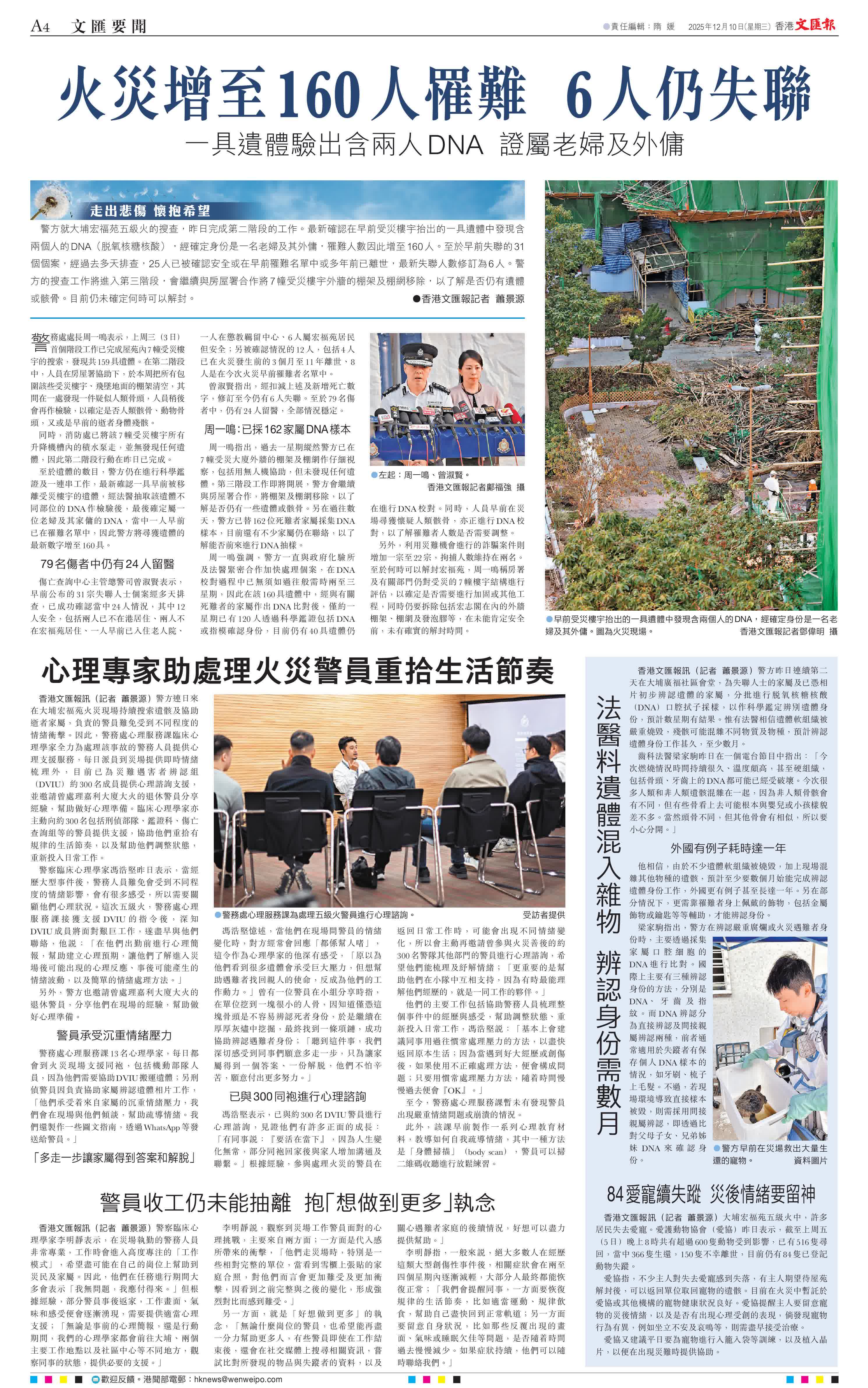 至於遺體的數目,警方仍在進行科學鑑證及一連串工作,最新確認一具早前被移離受災樓宇的遺體,經法醫抽取該遺體不同部位的DNA作檢驗後,最後確定屬一位老婦及其家傭的DNA,當中一人早前已在罹難名單中,因此警方將尋獲遺體的最新數字增至160具。