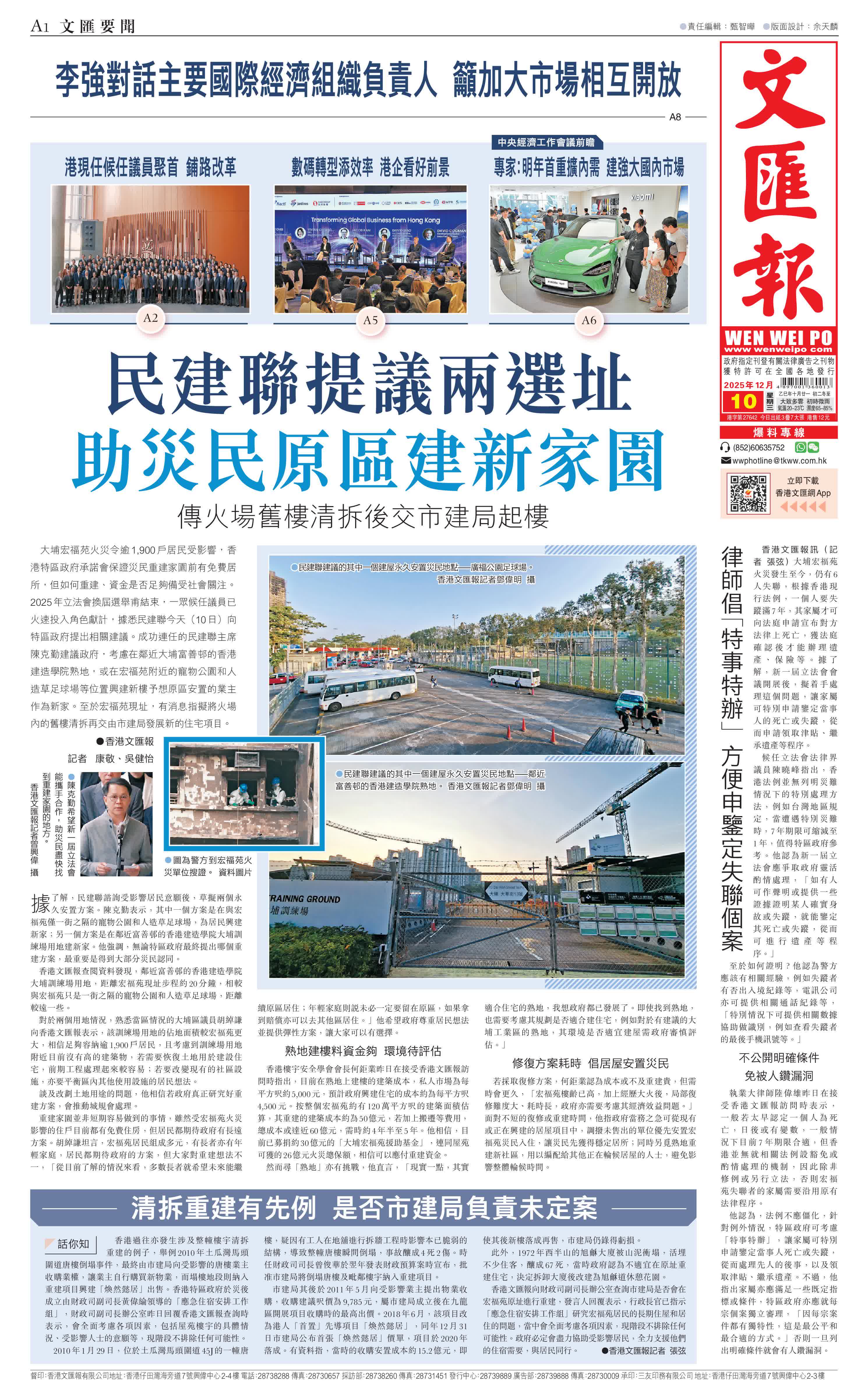(香港文匯報記者 康敬、吳健怡)大埔宏福苑火災令逾1,900戶居民受影響,香港特區政府承諾會保證災民重建家園前有免費居所,但如何重建、資金是否足夠備受社會關注。2025年立法會換屆選舉甫結束,一眾候任議員已火速投入角色獻計,據悉民建聯今天(10日)向特區政府提出相關建議。成功連任的民建聯主席陳克勤建議政府,考慮在鄰近大埔富善邨的香港建造學院熟地,或在宏福苑附近的寵物公園和人造草足球場等位置興建新樓予想原區安置的業主作為新家。至於宏福苑現址,有消息指擬將火場內的舊樓清拆再交由市建局發展新的住宅項目。