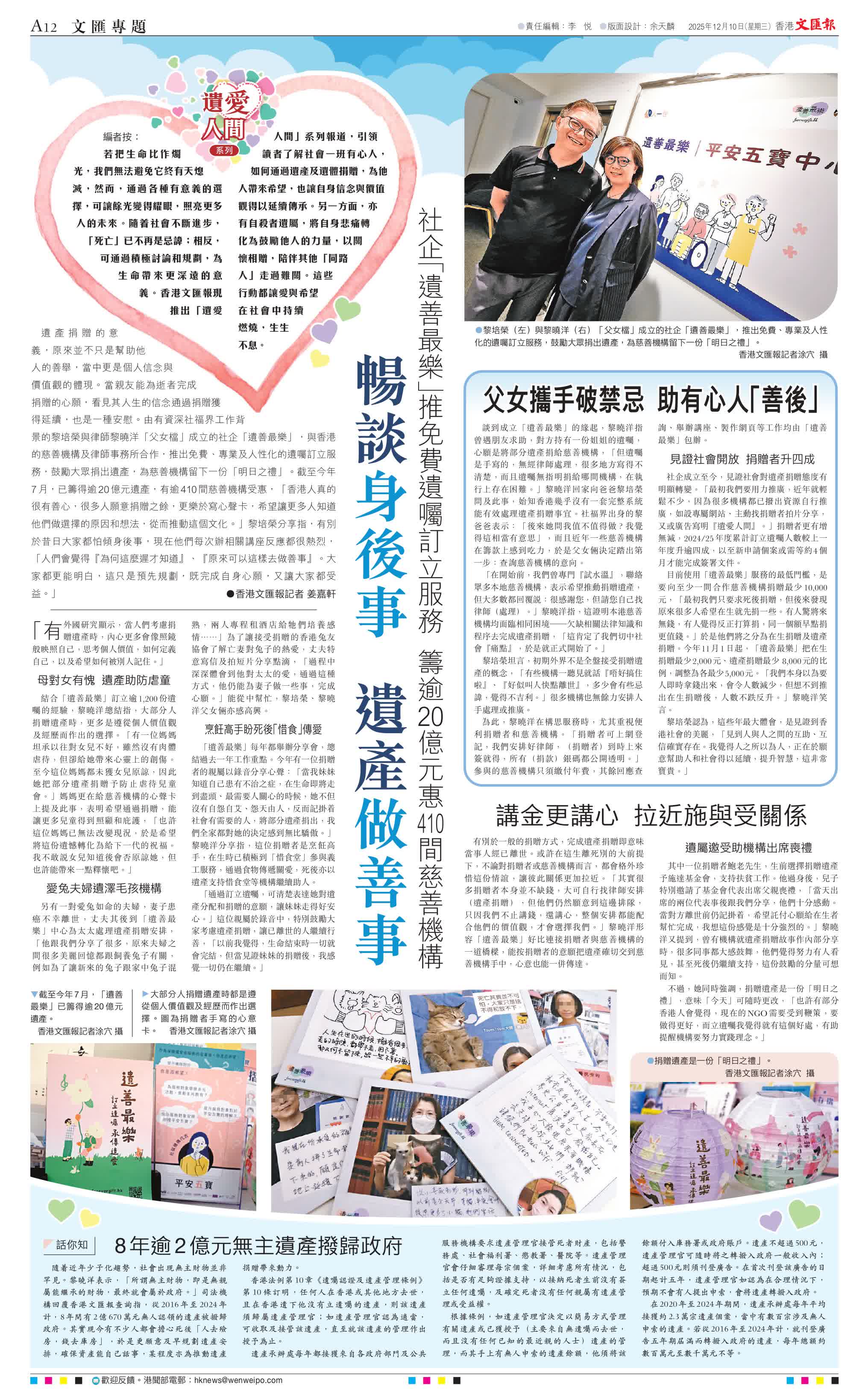 香港文匯報訊(記者 姜嘉軒)遺產捐贈的意義,原來並不只是幫助他人的善舉,當中更是個人信念與價值觀的體現。當親友能為逝者完成捐贈的心願,看見其人生的信念通過捐贈獲得延續,也是一種安慰。由有資深社福界工作背景的黎培榮與律師黎曉洋「父女檔」成立的社企「遺善最樂」,與香港的慈善機構及律師事務所合作,推出免費、專業及人性化的遺囑訂立服務,鼓勵大眾捐出遺產,為慈善機構留下一份「明日之禮」。截至今年7月,已籌得逾20億元遺產,有逾410間慈善機構受惠,「香港人真的很有善心,很多人願意捐贈之餘,更樂於寫心聲卡,希望讓更多人知道他們做選擇的原因和想法,從而推動這個文化。」黎培榮分享指,有別於昔日大家都怕傾身後事,現在他們每次辦相關講座反應都很熱烈,「人們會覺得『為何這麼遲才知道』、『原來可以這樣去做善事』。大家都更能明白,這只是預先規劃,既完成自身心願,又讓大家都受益。」