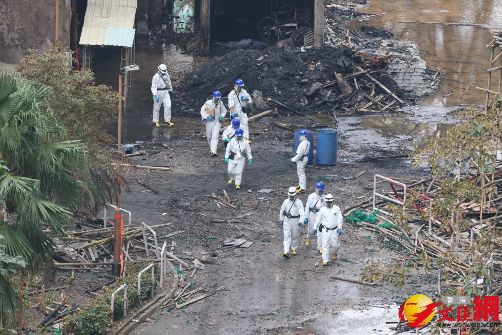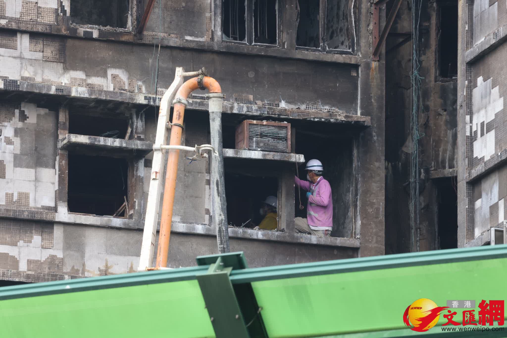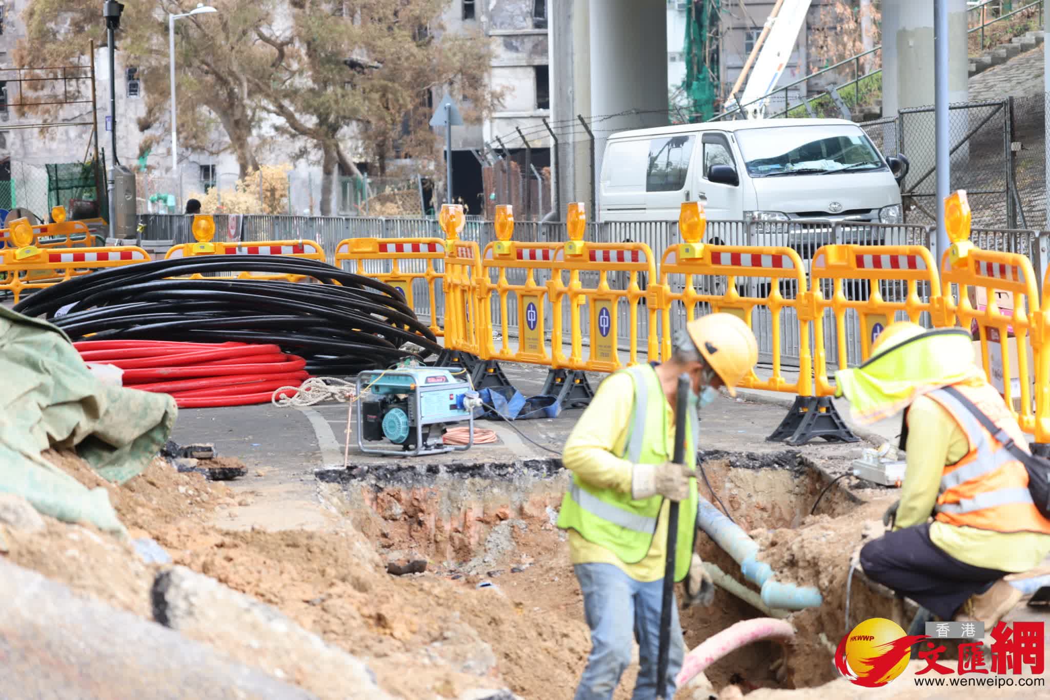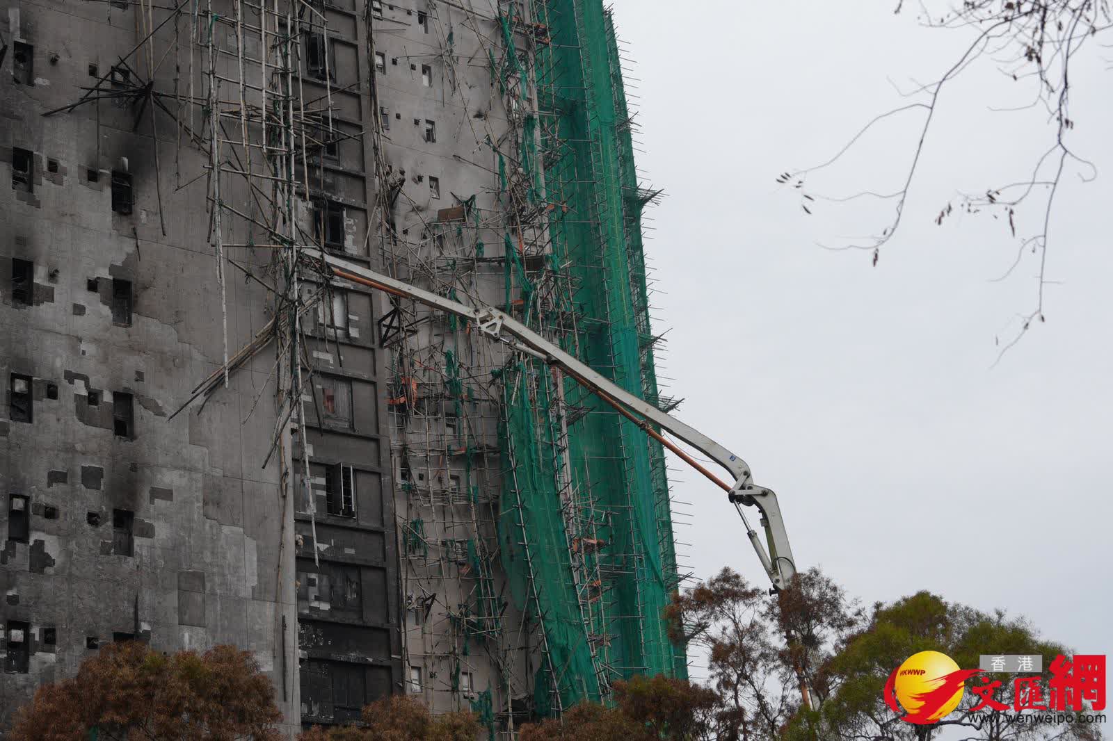 香港文匯報訊(記者 蕭景源)大埔宏福苑發生五級火警,造成嚴重傷亡,今日(10日)早上警方及消防處等相關部門人員繼續到場展開調查及現場清理工作,其間有吊臂車及石屎泵車等工程車抵達,相信為受大火嚴重焚燒的大廈進行鞏固結構,以及清理棚架竹枝及瓦礫等雜物,但見部份大廈的棚架被拆除後,露出嚴重焦黑外牆和窗戶;其間有工人操控石屎泵車向宏昌閣進行灌漿加固工程。此外,宏福苑對開有中電工程人員為重舖地底電纜進行挖地工程,上址一段道路需要封鎖。