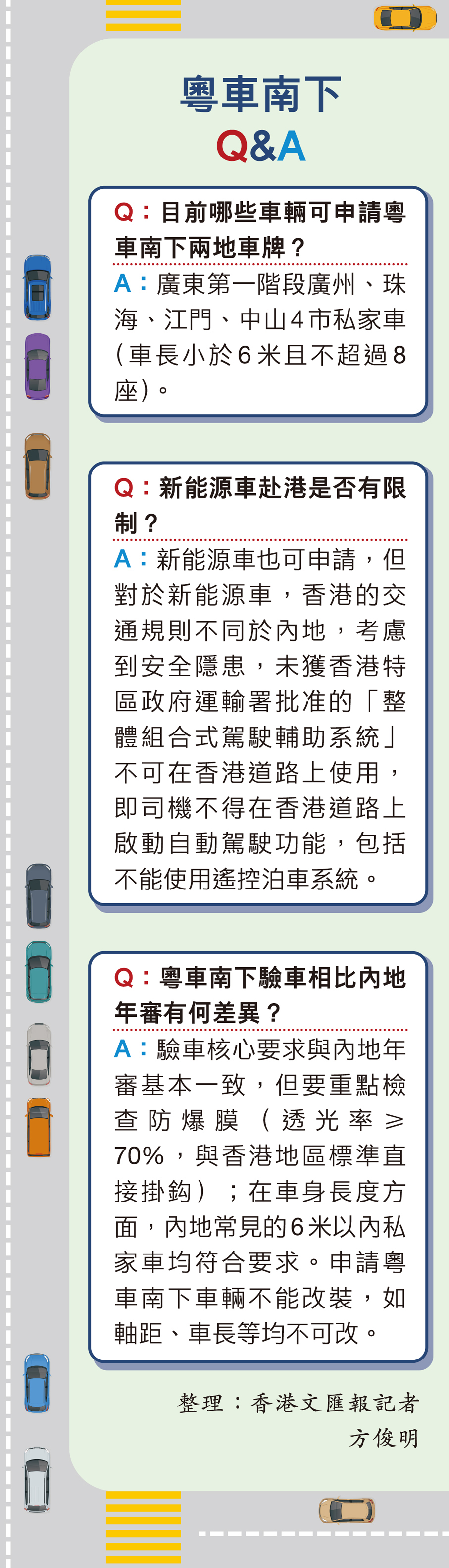粵車南下計劃將於本月23日起容許合資格粵車駛入市區,特區政府運輸署昨日宣布,接獲內地部門轉交逾百宗合資格廣東省私家車當日進入香港市區的部分申請,換言之計劃實施首天已滿額申請,反應踴躍。中籤來港的粵車必須在內地通過驗車、購買香港車輛第三者風險保險等流程。香港文匯報記者昨日走訪位於廣州的粵車南下車輛查驗中心,直擊最快25分鐘可完成驗車。粵車南下香港政策首批開放穗、珠、江、中4市的車輛查驗中心由最初的8個增至目前的13個,服務範圍也覆蓋上述4市車輛。香港的軟硬件已準備就緒,市區已布置多台國標充電器,基本滿足電動粵車充電的需求,香港汽車會建議粵車車主自備原廠充電轉駁器更方便。
