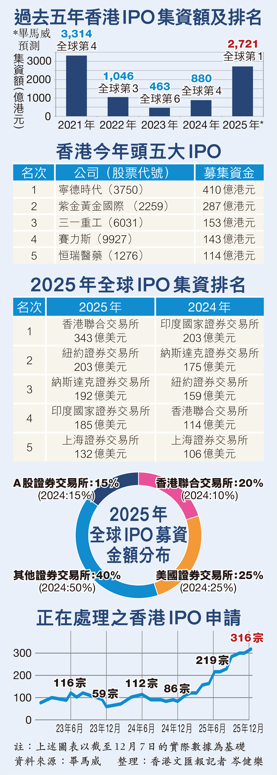 畢馬威統計顯示,香港IPO市場今年表現領先全球,預期籌集2,721億元,上市宗數達100宗,按年分別增長210%及43%,創下自2022年以來最大募資規模。整體增長主要來自A+H上市熱潮的帶動,相關項目佔全年IPO募資總額一半。年內香港完成17宗A+H上市,為歷來最多,進一步印證香港作為連接內地與國際資本市場橋樑的獨特優勢。