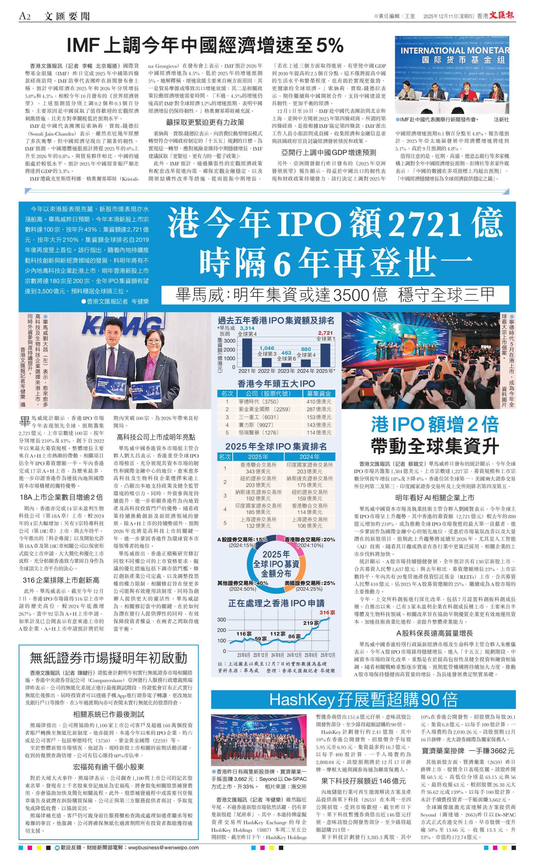 此外,畢馬威表示,截至今年12月7日,香港IPO市場錄得316宗上市申請的歷史高位,較2024年底激增267%,當中92宗為A+H上市申請。如果計及已公開表示有意來港上市的A股企業,A+H上市申請預計將於短期內突破100宗,為2026年帶來良好開局。