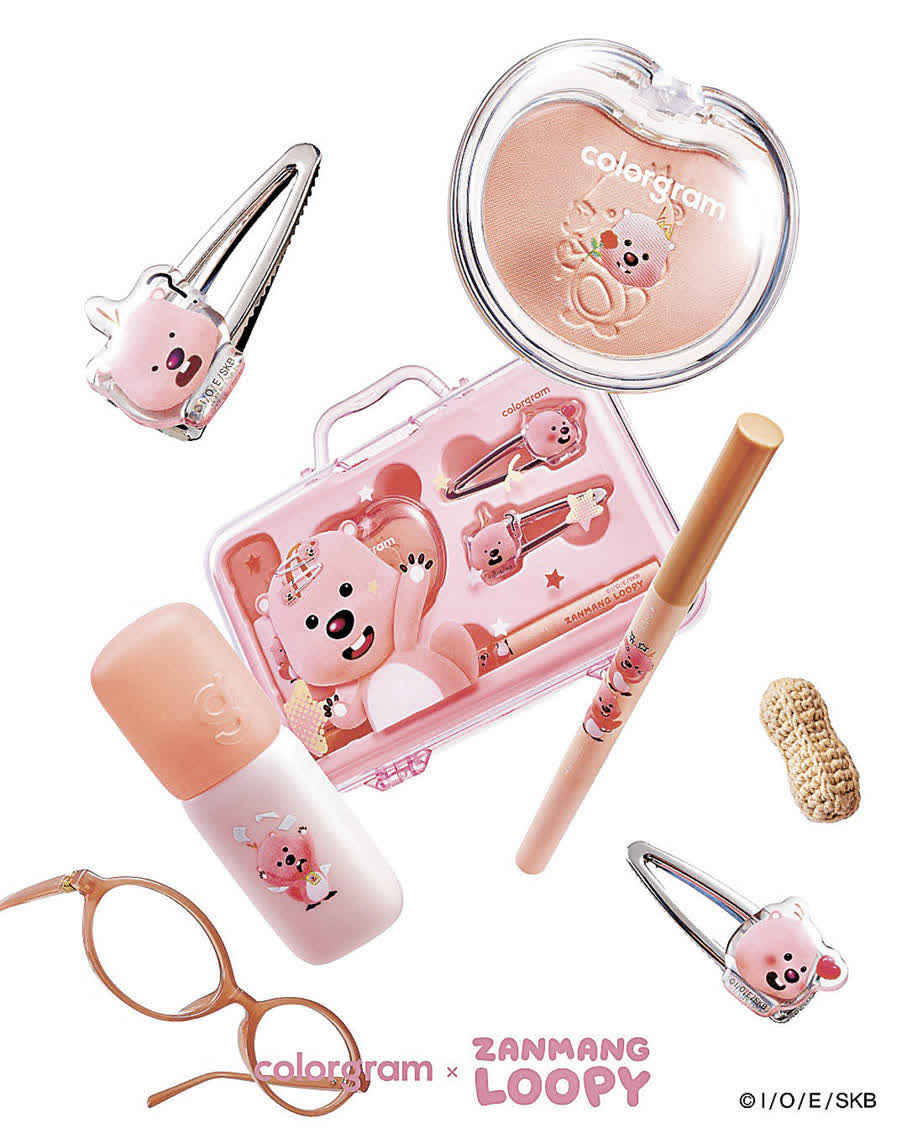 在韓國超火的卡通粉紅小海狸「Loopy」,攜手Colorgram打造一場色彩與可愛的夢幻聯乘。其中「裸感彩妝套裝」,一套有齊裸霧唇釉、卧蠶筆、胭脂與Loopy髮夾,可以根據膚色選擇冷調或者暖調,適合有選擇困難的你。另一款單品「Colorgram糖葫蘆水光唇釉」,輕抹即擁有糖葫蘆般晶亮唇膜,而且質地水潤不黏膩。眼妝產品方面,「Colorgram Loopy撒嬌愛心計算機12色眼影盤」,配色日常實用,一盤就可以化完眼妝,從基礎打底到高光重點色都能輕鬆完成。附贈的Loopy卡通圖案眼影掃,可愛得令人愛不釋手。