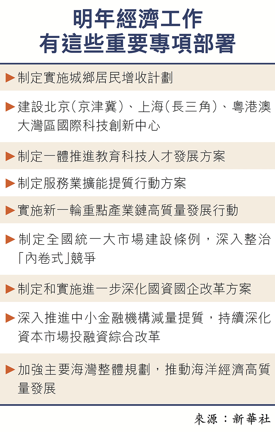 香港文匯報訊(記者 朱燁 北京報道)11日舉行的中央經濟工作會議明確提出,要堅持改革攻堅,增強高質量發展動力活力。制定全國統一大市場建設條例,深入整治「內卷式」競爭。制定和實施進一步深化國資國企改革方案,完善民營經濟促進法配套法規政策。加緊清理拖欠企業賬款。推動平台企業和平台內經營者、勞動者共贏發展。拓展要素市場化改革試點。健全地方稅體系。深入推進中小金融機構減量提質,持續深化資本市場投融資綜合改革。
