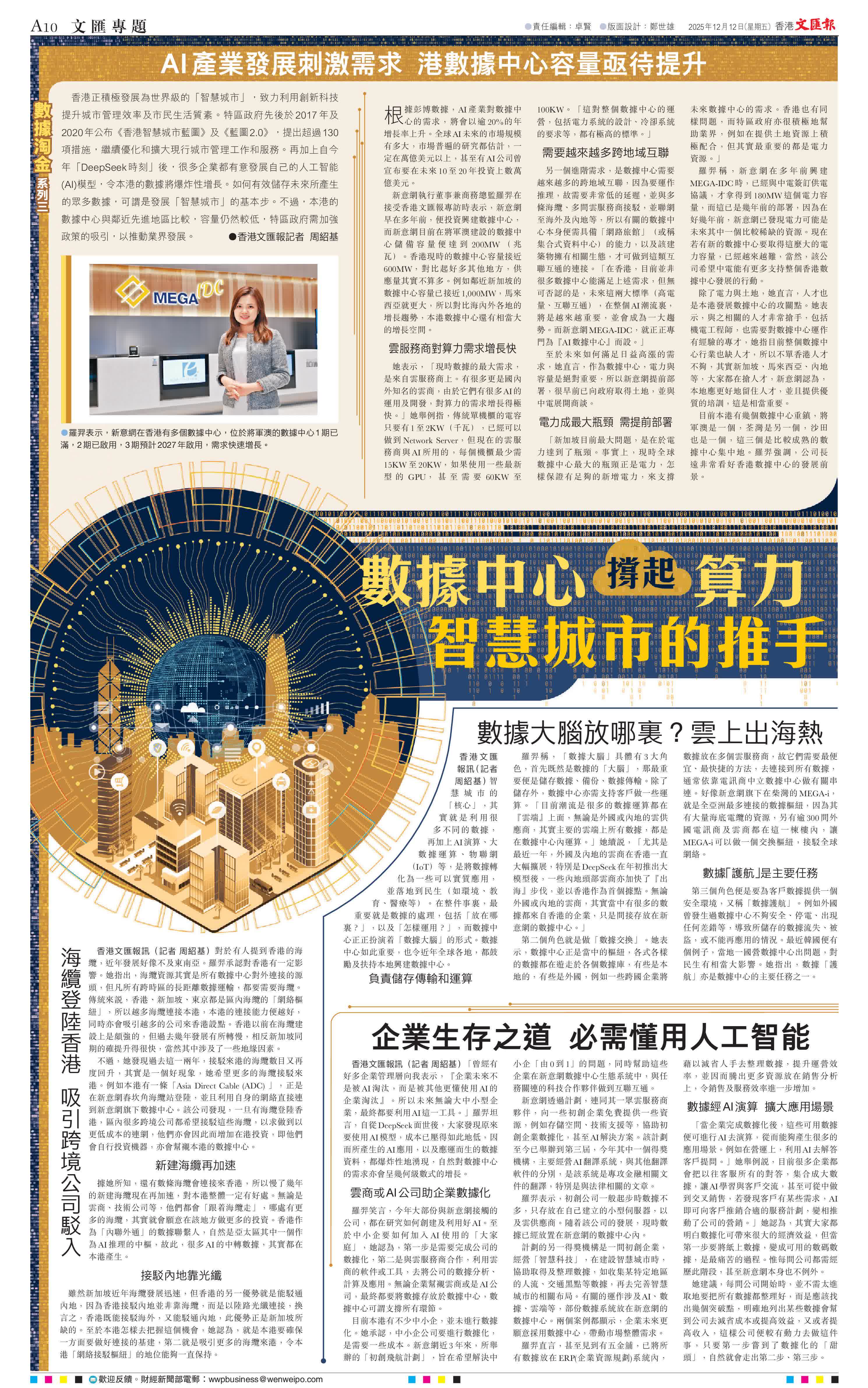 (香港文匯報記者 周紹基)香港正積極發展為世界級的「智慧城市」,致力利用創新科技提升城市管理效率及市民生活質素。特區政府先後於2017年及2020年公布《香港智慧城市藍圖》及《藍圖2.0》,提出超過130項措施,繼續優化和擴大現行城市管理工作和服務。再加上自今年「DeepSeek時刻」後,很多企業都有意發展自己的人工智能(AI)模型,令本港的數據將爆炸性增長。如何有效儲存未來所產生的眾多數據,可謂是發展「智慧城市」的基本步。不過,本港的數據中心與鄰近先進地區比較,容量仍然較低,特區政府需加強政策的吸引,以推動業界發展。