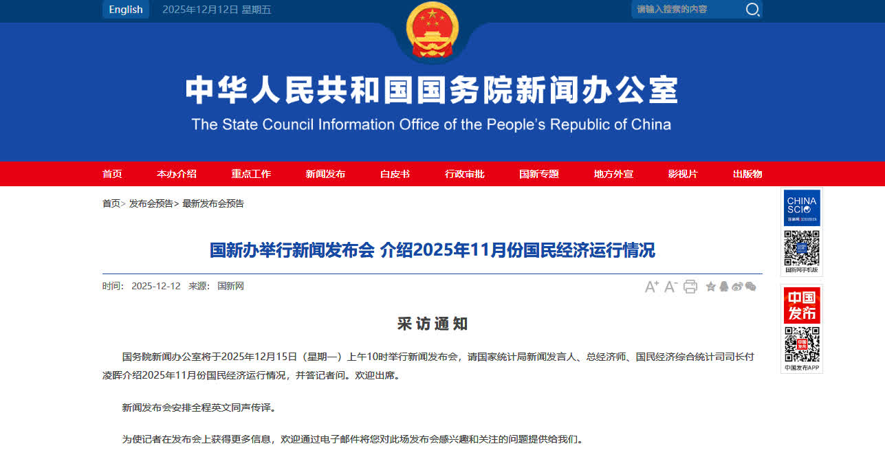 國務院新聞辦公室將於2025年12月15日(星期一)上午10時舉行新聞發布會,請國家統計局新聞發言人、總經濟師、國民經濟綜合統計司司長付凌暉介紹2025年11月份國民經濟運行情況,並答記者問。