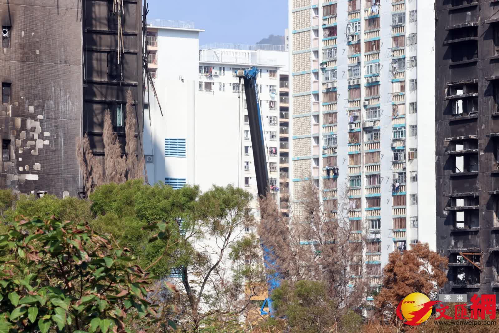 香港文匯報訊(記者 蕭景源)大埔宏福苑火災8幢樓宇有7幢遭焚毀,至今造成160人死亡包括一名消防員殉職,另有6人失聯,逾千戶家庭痛失家園。當局繼續在災場調查及搜索是否仍有遺骸,房屋署經與警方協調後,今日(12日)開始移除最先起火的宏昌閣,以及被波及的宏泰閣和宏新閣外牆被燒毀的棚架和棚網。香港文匯報記者現場所見已有大型吊臂車駛入宏福苑災場。