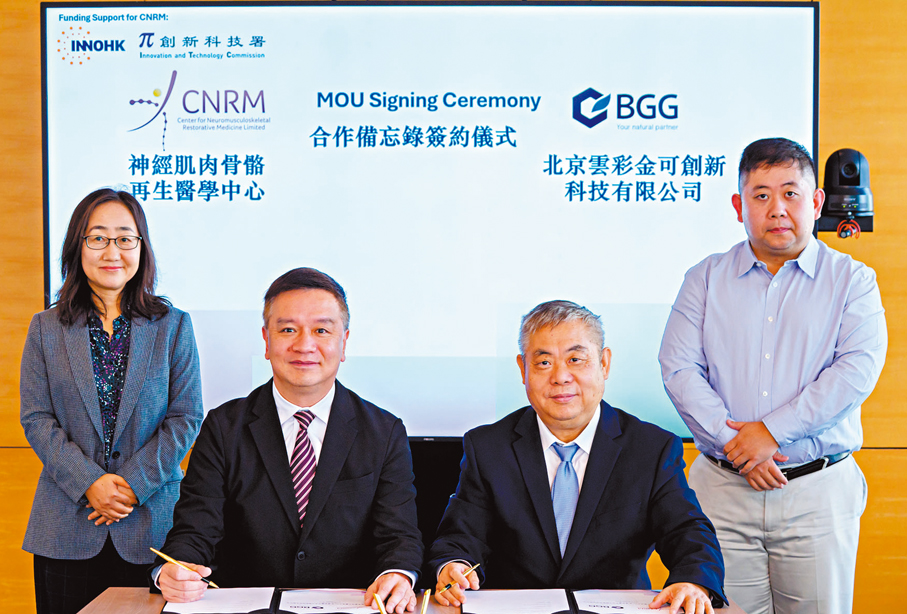 香港文匯報訊 香港中文大學InnoHK神經肌肉骨骼再生醫學中心(CNRM)昨日與全球知名天然健康成分企業北京金可集團(BGG)簽署合作備忘錄,確立為期3年的合作關係。此合作備忘錄旨在將先進生物醫學驗證技術整合應用於營養補充劑、藥品及個人護理產品的開發,標誌着InnoHK創新香港研發平台在學術研究轉化與商業化進程中邁向重要里程。