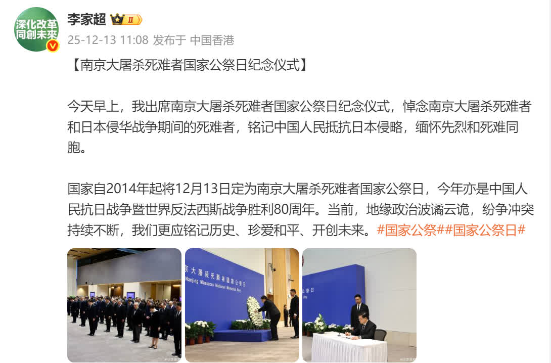 李家超在儀式後發文表示,國家自2014年起將12月13日定為南京大屠殺死難者國家公祭日,今年亦是中國人民抗日戰爭暨世界反法西斯戰爭勝利80周年。當前,地緣政治波譎雲詭,紛爭衝突持續不斷,我們更應銘記歷史、珍愛和平、開創未來。