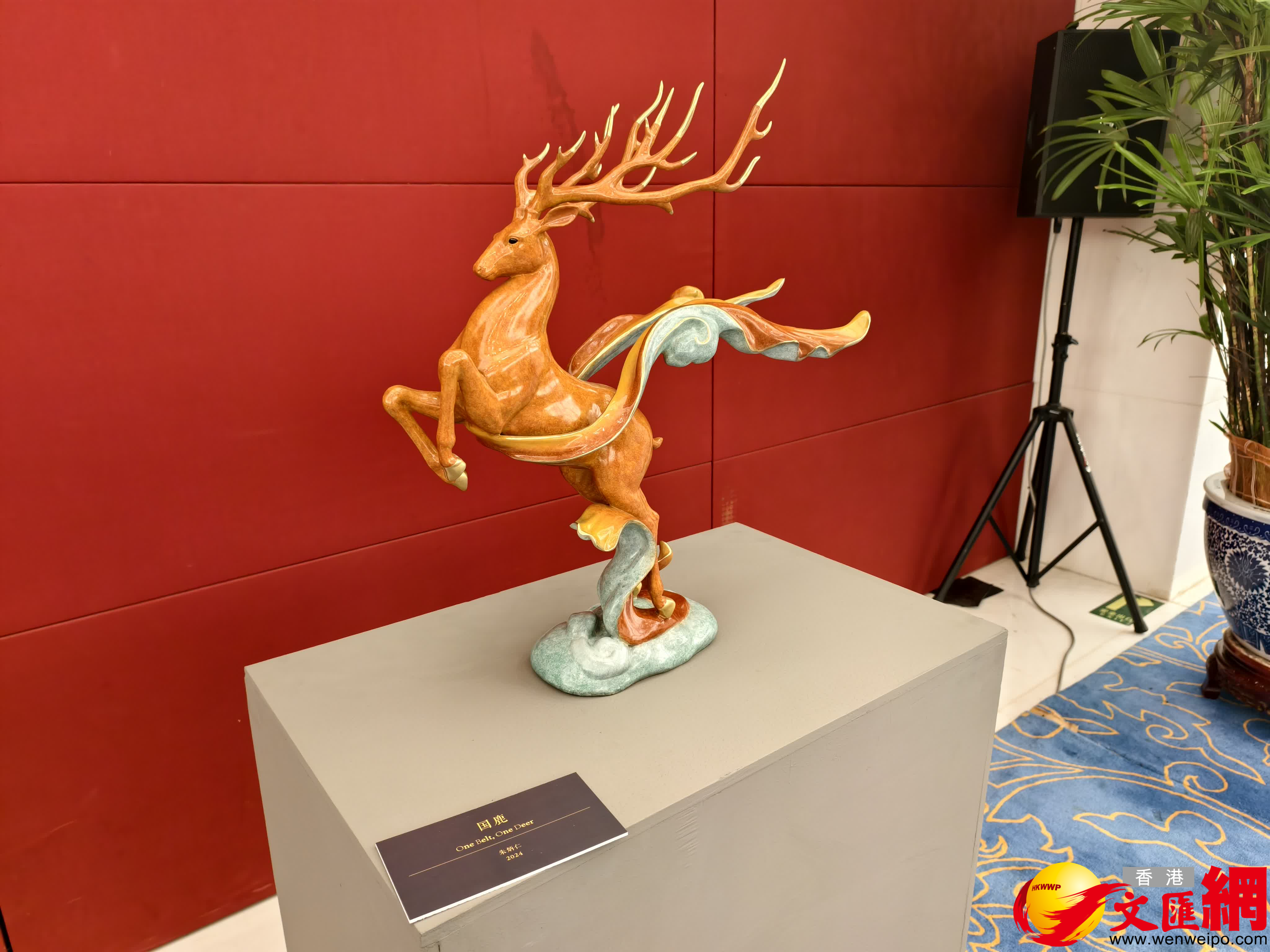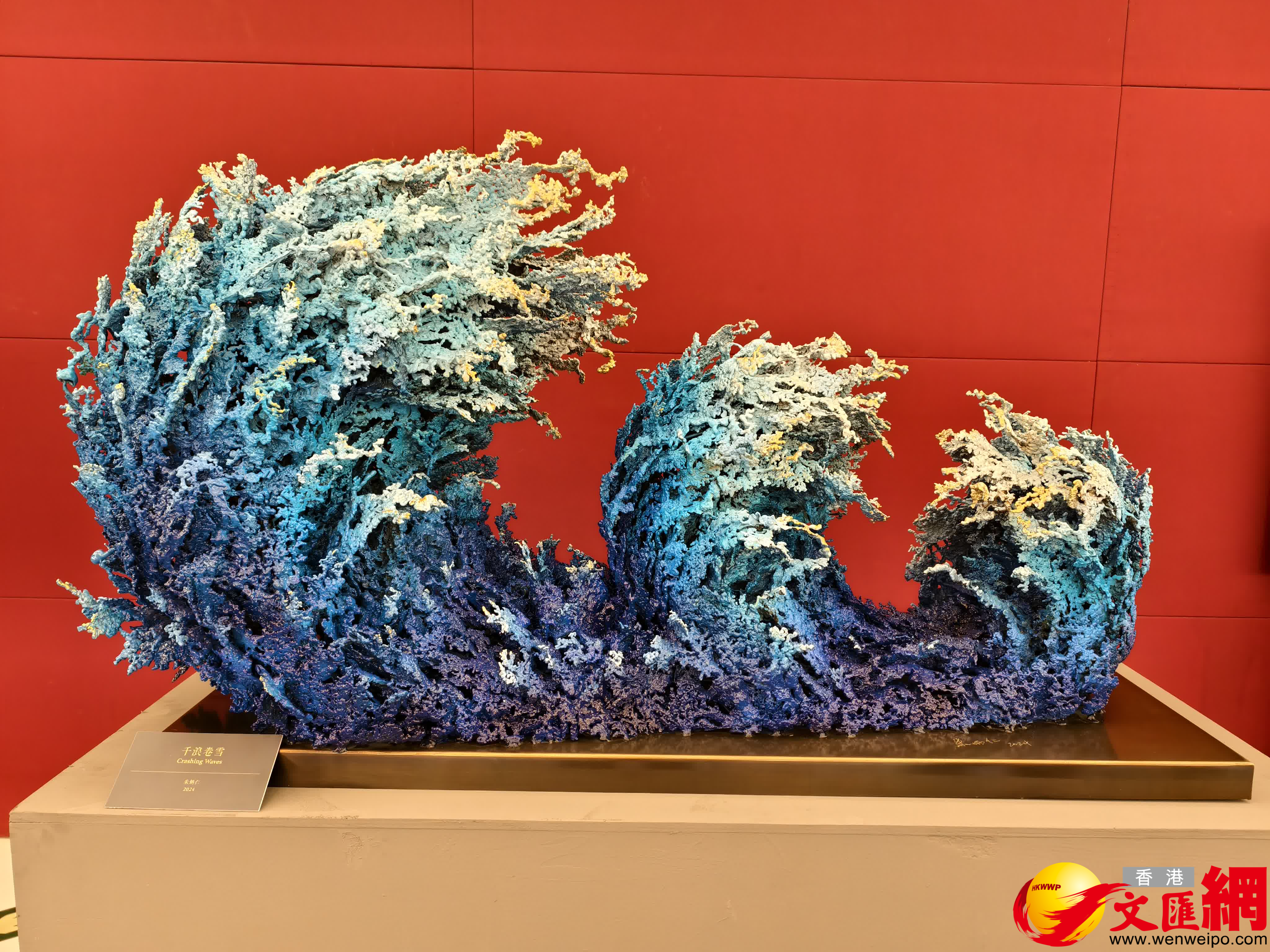 朱炳仁的10件作品涵蓋熔銅、庚彩、銅壁畫、雲水墨與銅印等多種形式:《燃燒的向日葵》《國鹿》《千里江山》《千浪卷雪》以流動的熔銅肌理再現自然萬象;庚彩《青花銅瓶》借鑒琺琅彩技法,讓古銅煥發流光溢彩;銅壁畫《萬里長城》則延續其「中國銅壁畫創始人」的藝術脈絡;雲水墨《鵝池》與熔銅山水銅印,展現了朱炳仁在書畫與金石跨界領域的深厚造詣。朱軍岷的4件熔銅清供《連年如意》《繁花似錦》《蕉石鶴壽》《萬全如意》,將傳統清供文化與熔銅工藝完美融合,為傳統銅藝注入鮮活的當代審美活力。朱炳仁說:「國博的收藏,是為中國五千年的銅文化續寫家譜。熔銅藝術能作為新的一頁載入史冊,意味着這門年輕的藝術已經接過了歷史的薪火,完成了從『技』到『藝』的文明接力。」
