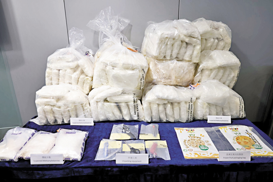 香港文匯報訊(記者 蕭景源)跨國販毒集團將242公斤、市值超過8,200萬元的冰毒,混入急凍生果肉,由墨西哥經空運到香港,經正當物流公司提貨及送到葵涌一幢工業大廈的毒品儲存倉。毒品調查科根據情報全程跟蹤,在毒倉拘捕4名男子,包括3名被利誘充當毒品「拆家」的中學生,正通緝招攬中學生販毒的黑手,本案為今年警方檢獲冰毒數量最大的案件。警方指,對利用未成年人販毒的毒販,會向法庭申請加刑。