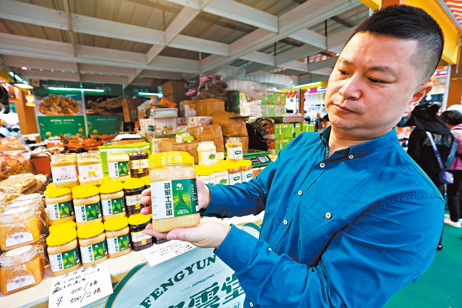 工展會今年新增的「家鄉風味區」區域中,已連續16年參加工展會的四川省供貨商商會,其負責人羅先生表示,今年展位從兩個擴增至四個,人手也相應翻倍達十餘人,而其展位主打蜂蜜、核桃、豬肉乾等特色產品,推出買兩罐蜂蜜送一罐等優惠活動。