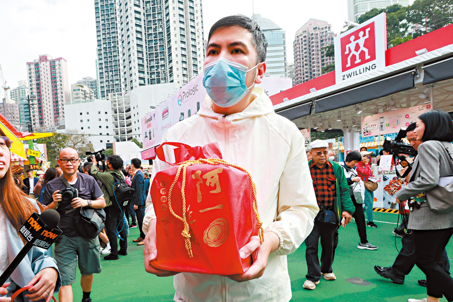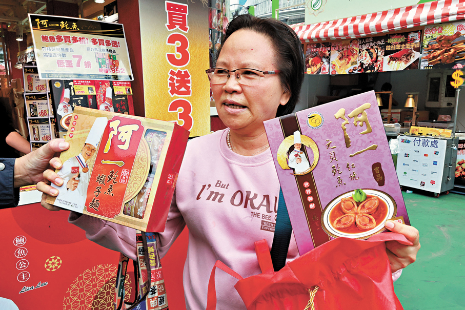 最後一位搶到「1蚊」鮑魚禮包的陸女士對香港文匯報表示,她昨日上午9時許到現場排隊,認為能搶到禮包「非常開心,真係好有福氣」。