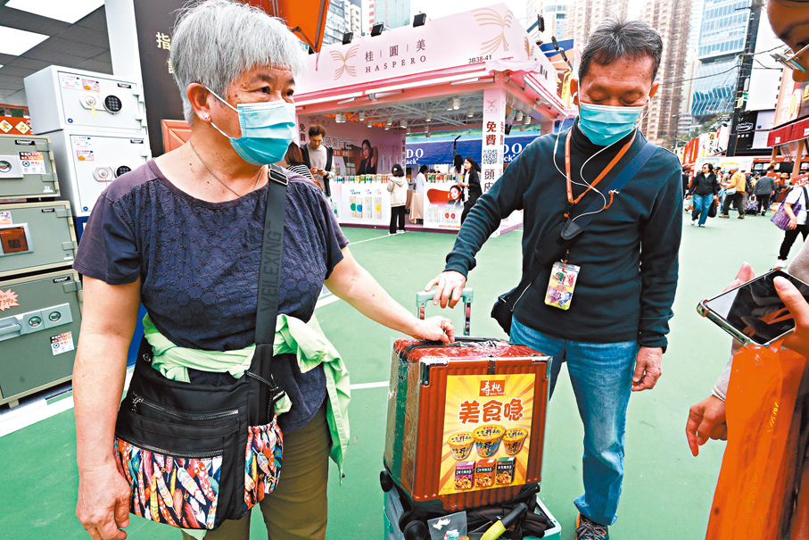 另一市民關先生與妻子在上午11時許抵達會場,為了獲得商家「買麵送篋(行李箱)」優惠,專門加錢購買麵食,「百幾蚊買個麵就送咗個篋,幾抵!」關先生說,今年商家的贈品活動頗有新鮮感。此外,他計劃購買牛肝、飲品和茶葉等,總預算約2,000元左右,指出部分商品雖然需要支付現金才能換取贈品,但這一規定並未影響其購買意慾。