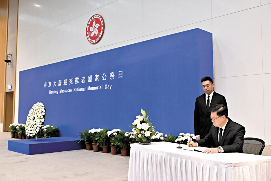 昨日是第十二個南京大屠殺死難者國家公祭日。香港特區政府昨日上午在政府總部舉行「南京大屠殺死難者國家公祭日」紀念儀式,悼念南京大屠殺死難者。出席公祭儀式的特區行政長官李家超其後在社交平台發帖表示,當前地緣政治波譎雲詭,紛爭衝突持續不斷,大家更應銘記歷史、珍愛和平、開創未來。