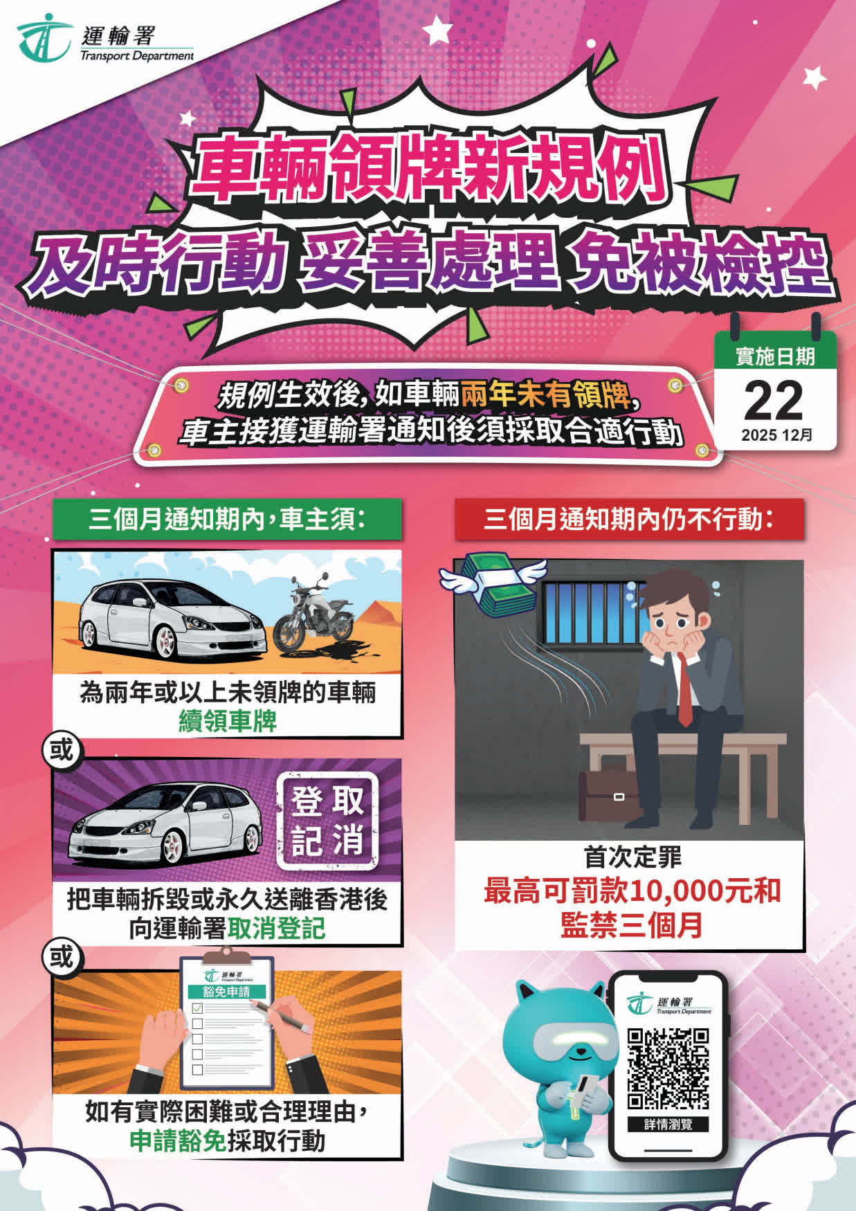 運輸署今日(14日)提醒登記車主,車輛登記及領牌新制度將於12月22日(星期一)起實施,旨在加強規管長期未領牌的車輛,從源頭解決不當棄置車輛的問題。在新制度下,未領牌車輛將一直登記在車主名下,車主須為其車輛負上責任。