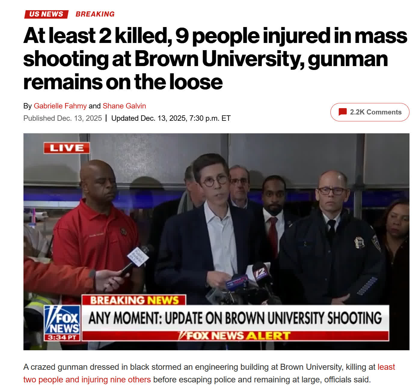 美國警方13日表示,位於羅得島州普羅維登斯市的布朗大學當天下午發生槍擊事件,多人中彈。據《紐約郵報》報道,事件造成至少兩人死亡、九人受傷,槍手隨後逃脫警方追捕,目前仍然在逃。