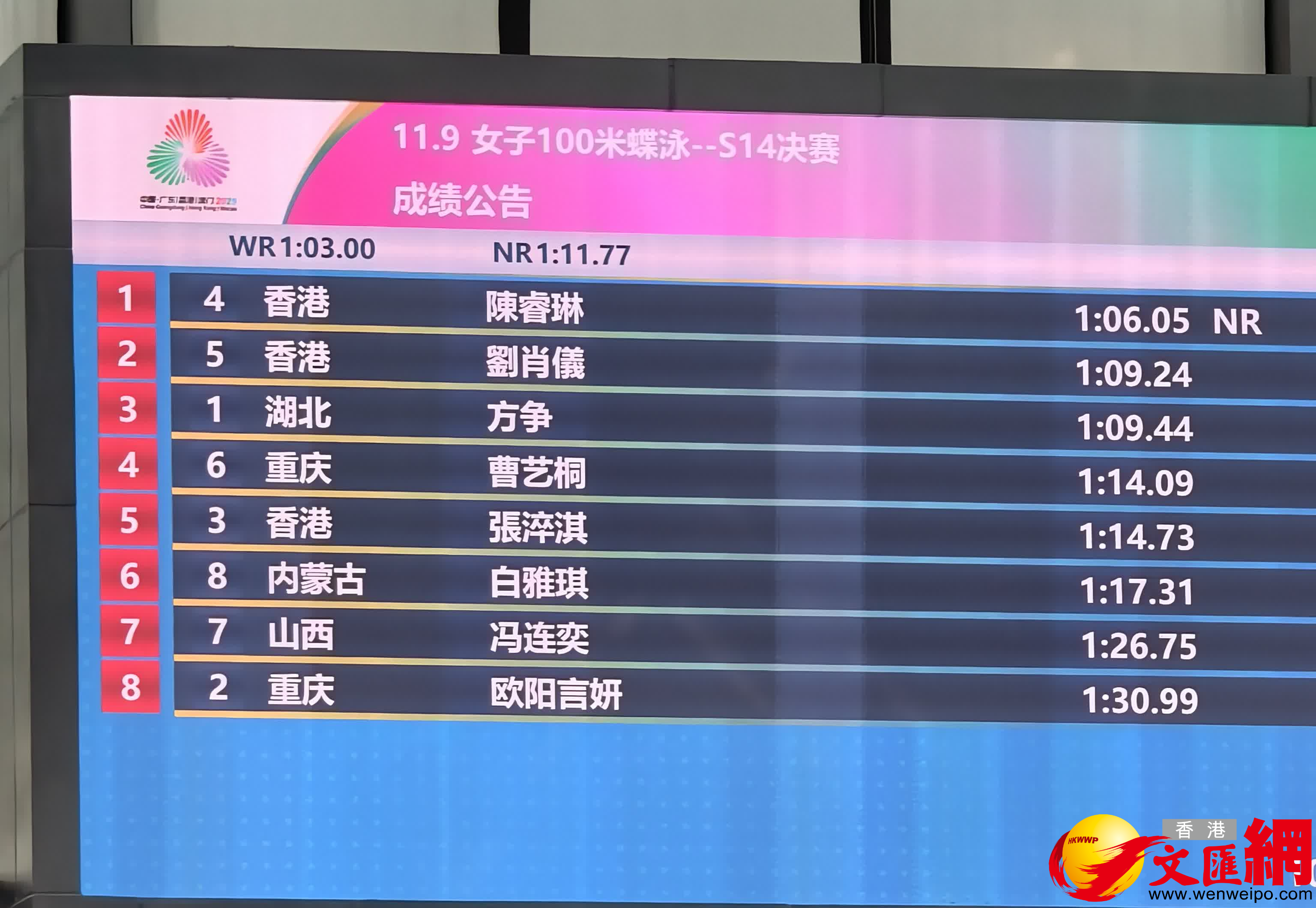 (香港文匯網記者 胡永愛、李薇、石華)在剛剛結束的殘特奧會女子100米蝶泳S14級決賽中,香港隊選手陳睿琳以1分06秒05成績奪得金牌並打破全國最好成績,隊友劉肖儀以1分09秒24成績拿下銀牌!