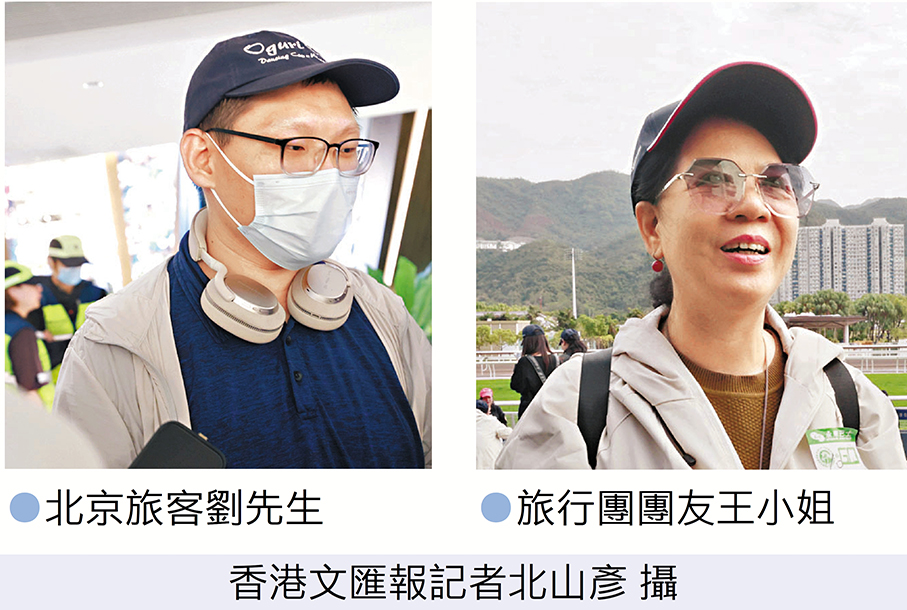 除個人遊旅客外,現場亦有約40人的江門旅行團到場,該入境團即日來回,特意加入觀看賽馬行程,在馬場逗留3個小時。參加旅行團的旅客王小姐首次來香港觀看賽馬,「現場好唔一樣,好激動!」而她在賽馬會新地標「天馬驛」,與一比一機械馬合照留念,她指出無論是馬匹的聲音或是表情,像真度超高。