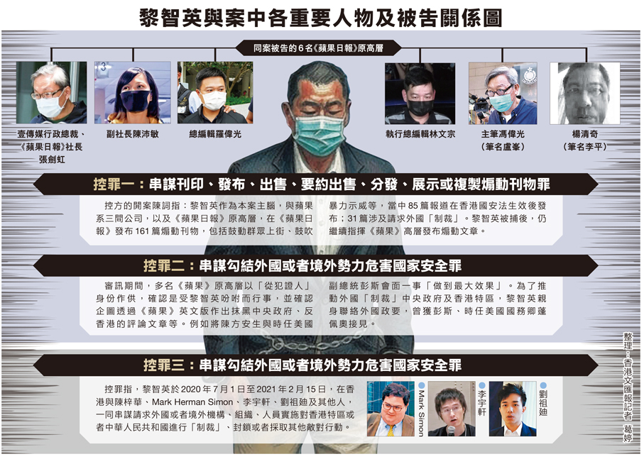 黎智英與蘋果日報有限公司、蘋果日報印刷有限公司及蘋果日報互聯網有限公司,被控《刑事罪行條例》下的串謀刊印、發布、出售、要約出售、分發、展示或複製煽動刊物罪,以及香港國安法下的串謀勾結外國或者境外勢力危害國家安全罪;黎智英另外被單獨控告一項串謀勾結外國或者境外勢力危害國家安全罪。