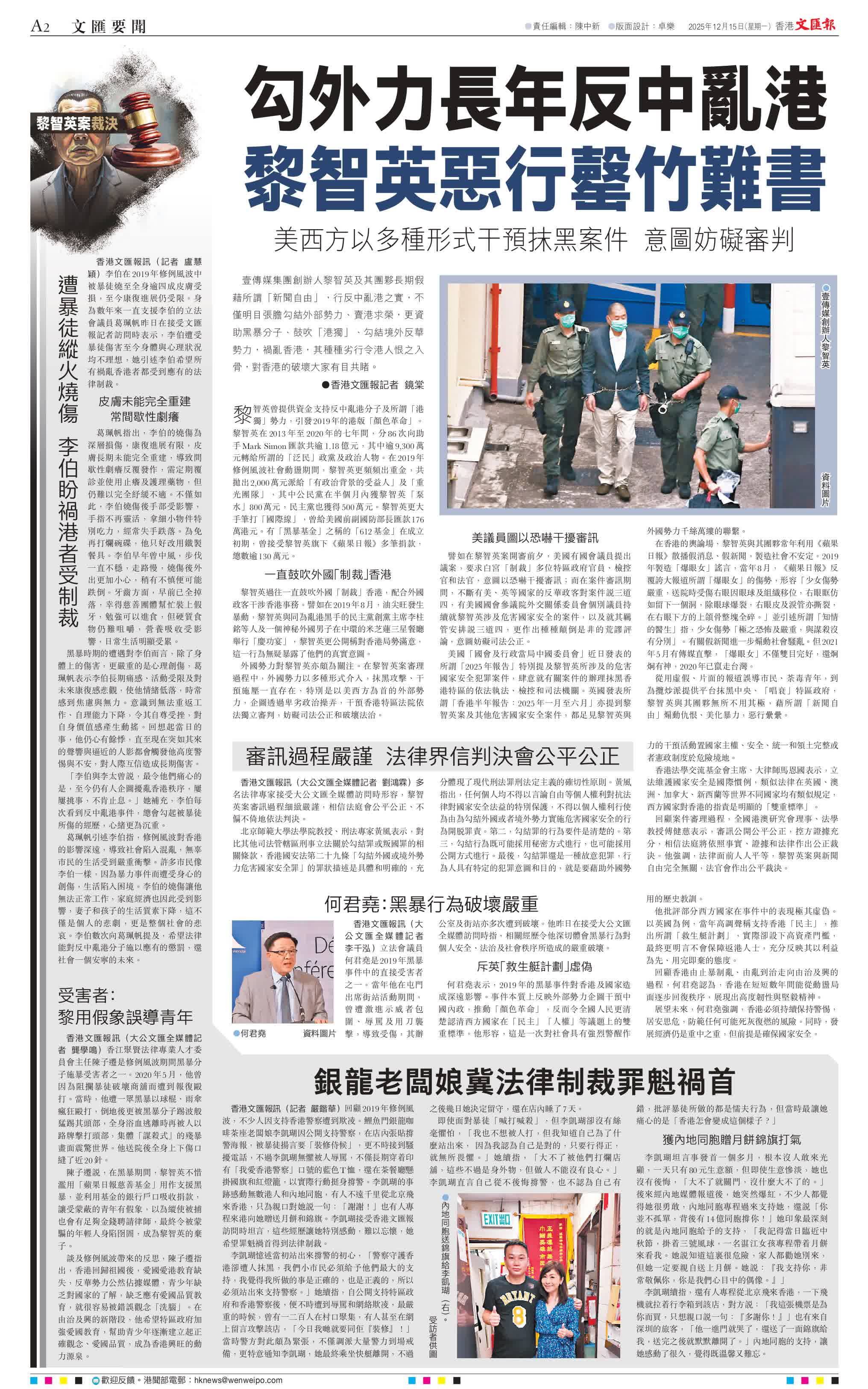香港文匯報訊(記者 鏡棠)壹傳媒集團創辦人黎智英及其團夥長期假藉所謂「新聞自由」,行反中亂港之實,不僅明目張膽勾結外部勢力、賣港求榮,更資助黑暴分子、鼓吹「港獨」、勾結境外反華勢力,禍亂香港,其種種劣行令港人恨之入骨,對香港的破壞大家有目共睹。