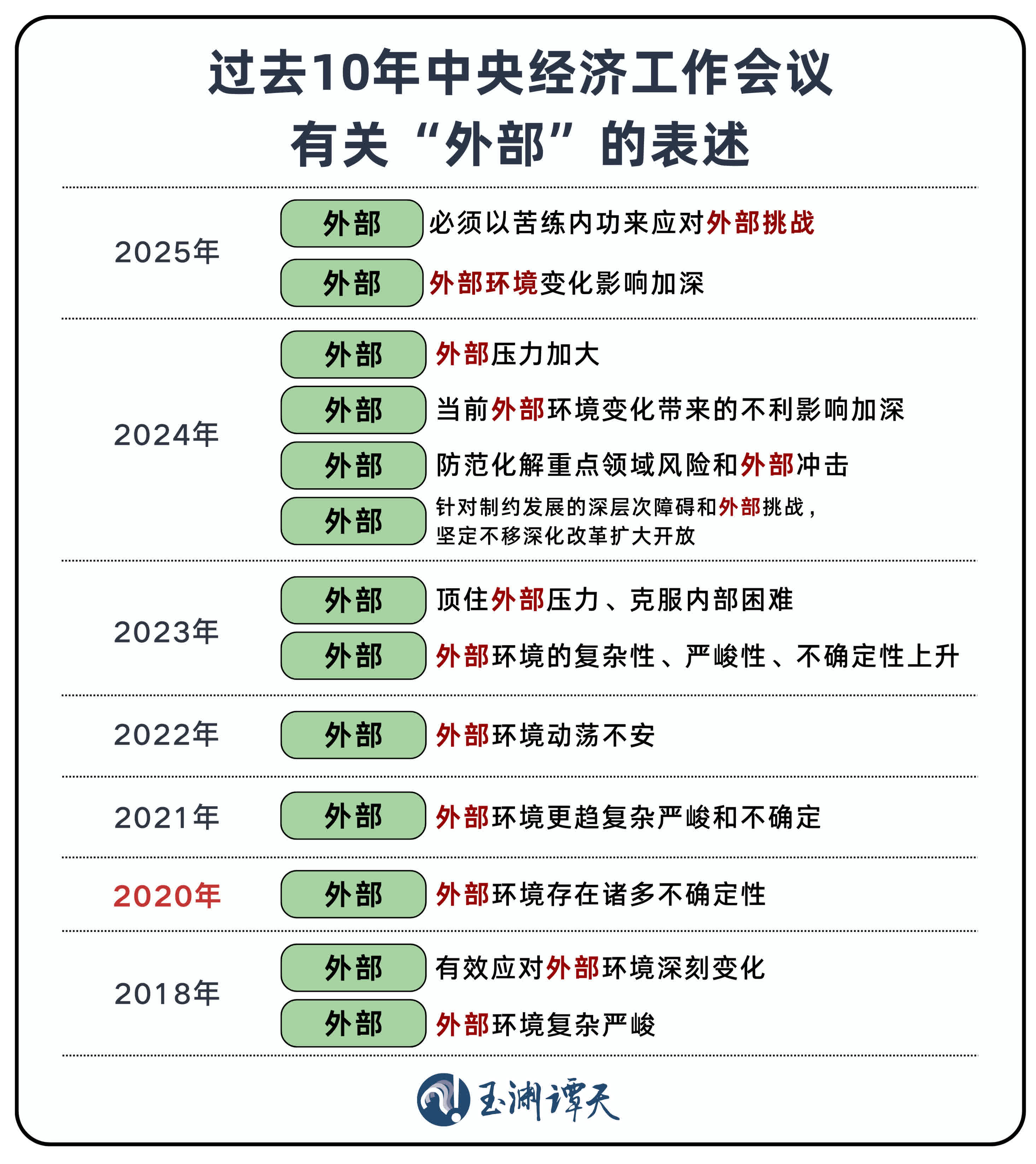 與之對應的一個細節是,從2018年開始,中央經濟工作會議新聞稿開始提及「外部」這個詞。這意味着,過去五年,我們一直是在巨大壓力中夯基壘石。