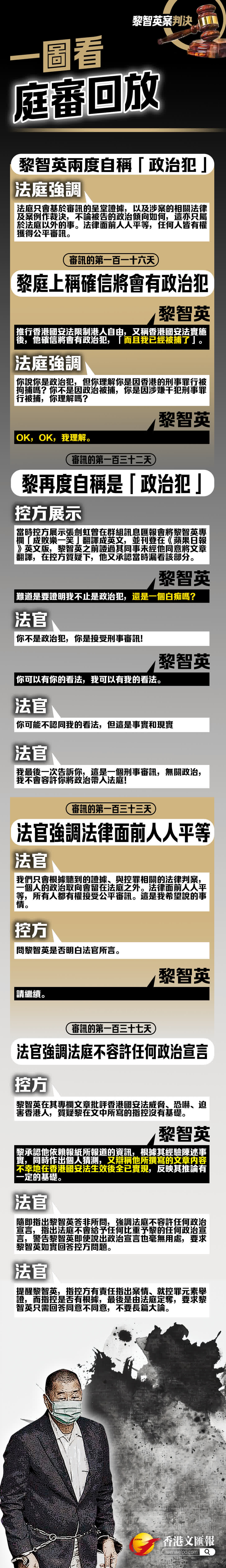 香港文報報訊(記者 葛婷) 黎智英在受審期間,兩度在庭上自稱是「政治犯」來搪塞盤問,法官杜麗冰毫不含糊地嚴厲駁斥黎智英:「你不是政治犯,你是接受刑事審訊!」」另外,黎智英在審訊中,多次借控方證據借題發揮,大肆宣揚其政治立場,被法官斥責答非所問,明言指出黎智英的政治言論並不是答案,法庭不會給予任何比重。法官也鄭重告訴黎智英:「法庭只會基於審訊的呈堂證據,以及涉案的相關法律及案例作裁決,不論被告的政治傾向如何,這亦只屬於法庭以外的事。法律面前人人平等,任何人皆有權獲得公平審訊。」