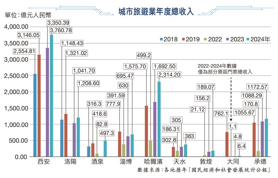 2024年春季,天水麻辣燙爆紅,全年遊客量達5,950萬人次,收入383億元,較2019年顯著增長,但人均消費僅為644元,低於全省平均的892元。2019年天水人均消費為631元,佔全省旅遊收入的比重也從11.5%降至7%。2023年,「南方小土豆」現象帶火的哈爾濱全年接待遊客1.35億人次,旅遊收入1,692.5億元,分別比2019年增長41.4%與7.4%。雖創歷史新高,但人均消費水平同樣呈下降趨勢。