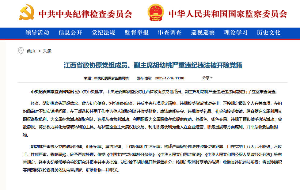 經中共中央批准,中央紀委國家監委對江西省政協原黨組成員、副主席胡幼桃嚴重違紀違法問題進行了立案審查調查。