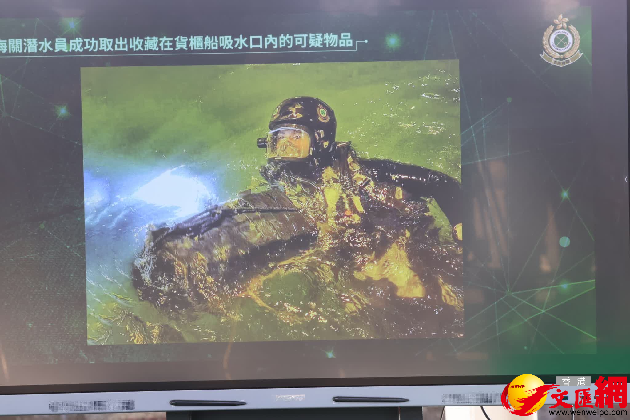 海關港口及海域科海域行動課監督羅展文表示,該目標貨船在案發當日凌晨進入香港水域,當貨櫃船抵達貨櫃碼頭後,關員隨即登船對船員及船艙進行搜查,但未有發現。經風險評估後,海關決定派出潛水隊在船底作深入搜查。該貨船總長度有333米,闊48米,水下面積接近3個標準足球場,搜查過程猶如大海撈針,在水底下,陽光被船身遮蓋,光線嚴重不足,伸手不見五指,為了增加搜查效率,海關派出潛水機械人進行大面積搜查,結果在右舷船底11米深、一個大約長0.8米、闊0.5米的吸水門閘門內,發現了一些大型並用防水物料包裹的可疑物品。