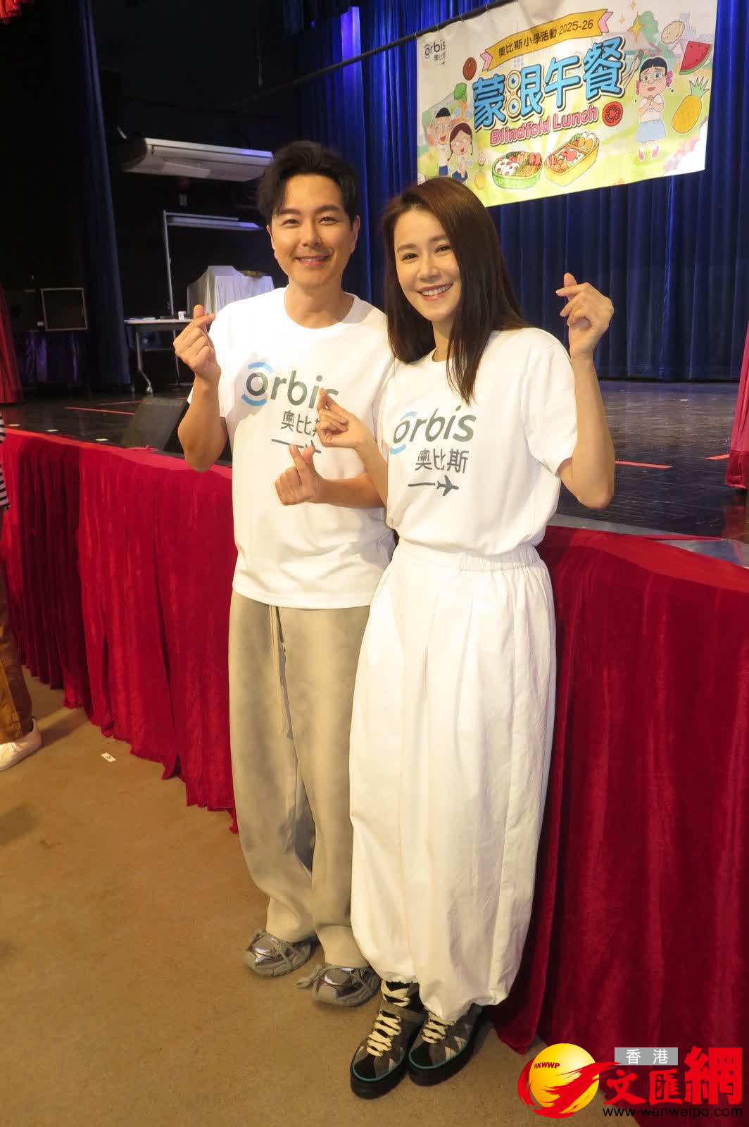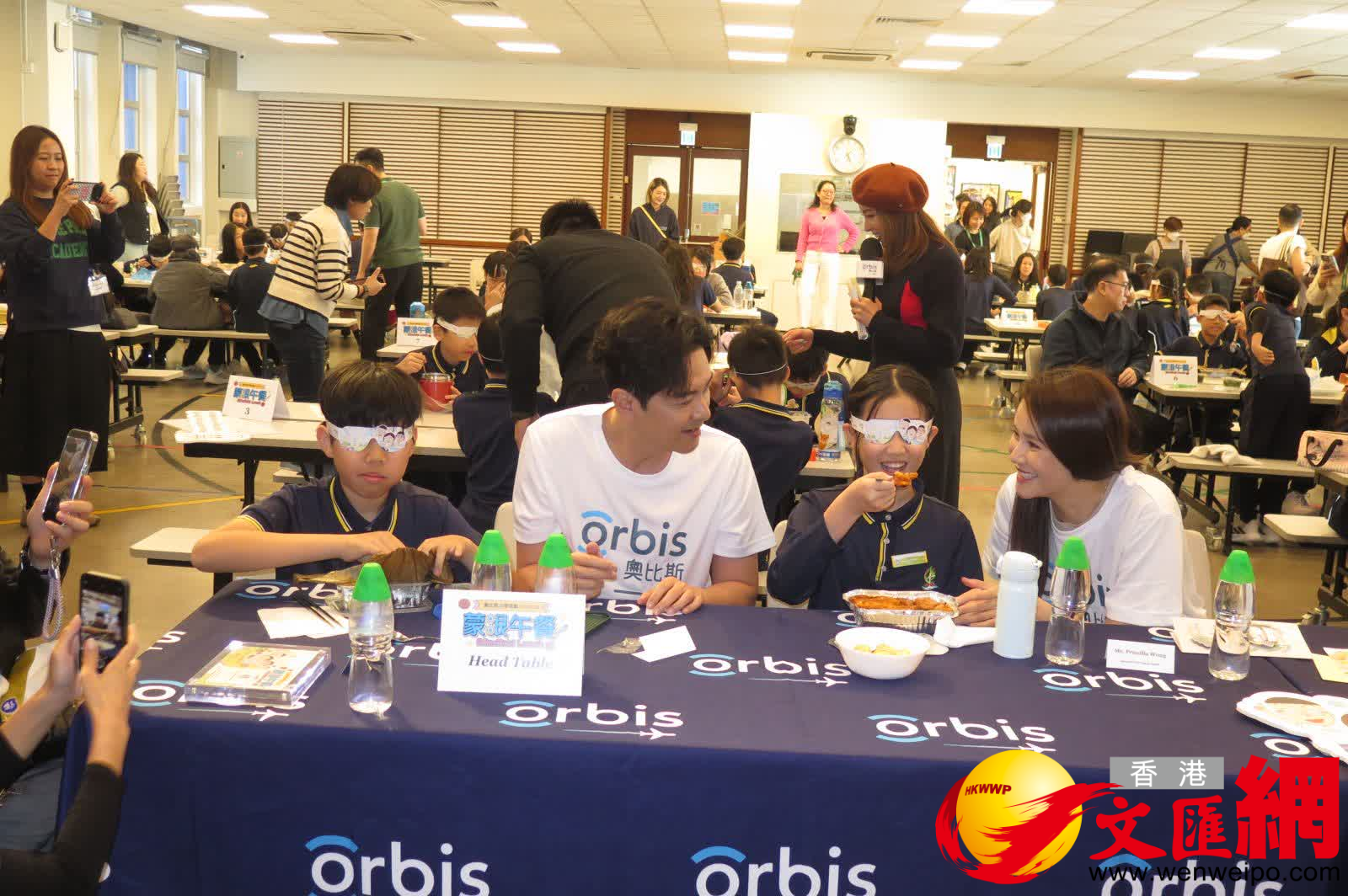 香港文匯報訊(記者 阿祖)蕭正楠(阿蕭)與黃翠如昨日與學生一起參與「奧比斯蒙眼午餐」,協助蒙眼的學生吃午餐。二人原來都曾患有眼疾,翠如因單眼近視導致另一隻「懶惰眼」,阿蕭則眼部有疤,於是齊齊去做矯視手術。術後視力未即時恢復,兩人互相扶持着去搭車,翠如笑言四隻眼得她一隻眼能看到,在矇查查的環境下去截車,這段經歷令他倆明白眼睛健康的重要性。