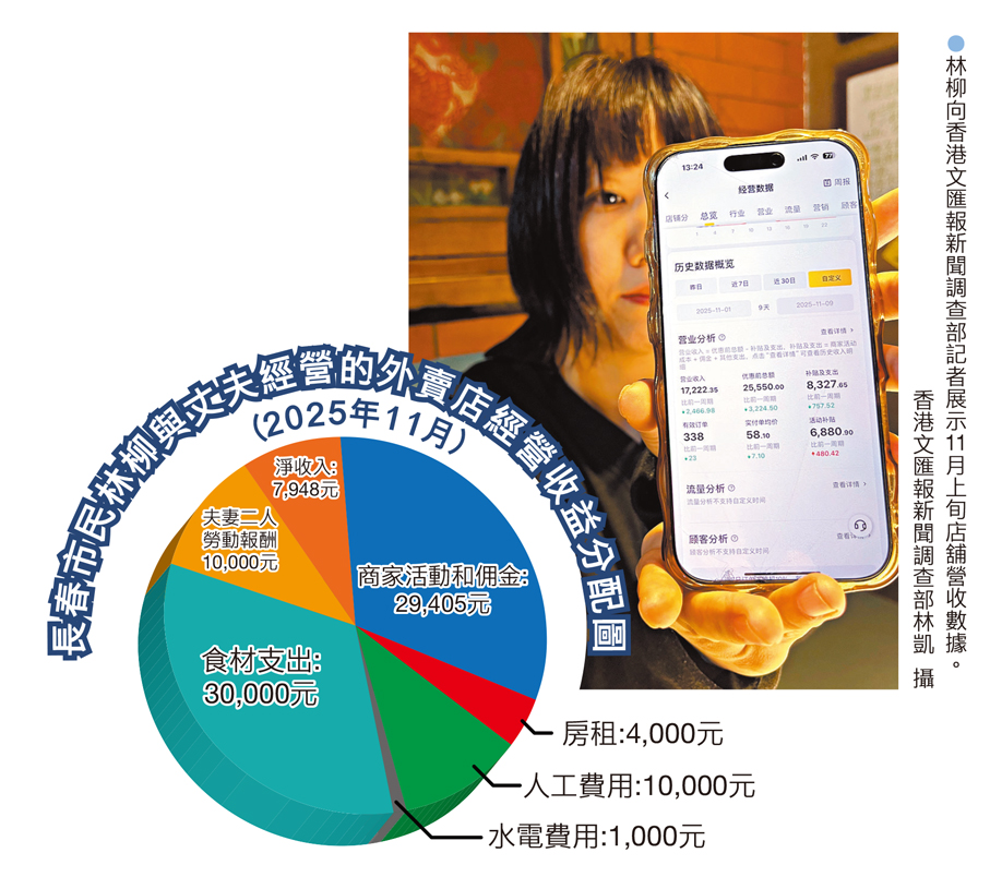 吉林長春市民林柳與丈夫經營的外賣店便面臨困境。雖然每日訂單穩定,但高度依賴平台推廣與補貼,一旦停止參與,訂單量立刻下滑。2025年11月上旬,該店完成338單,商品總額25,550元,平台抽成與補貼抵扣後實收僅17,222.35元,抽成比例高達32.6%。扣除人工、房租、水電等成本後,夫妻二人平均每月收入僅約1.3萬至1.5萬元,其中包含兩人勞動報酬。