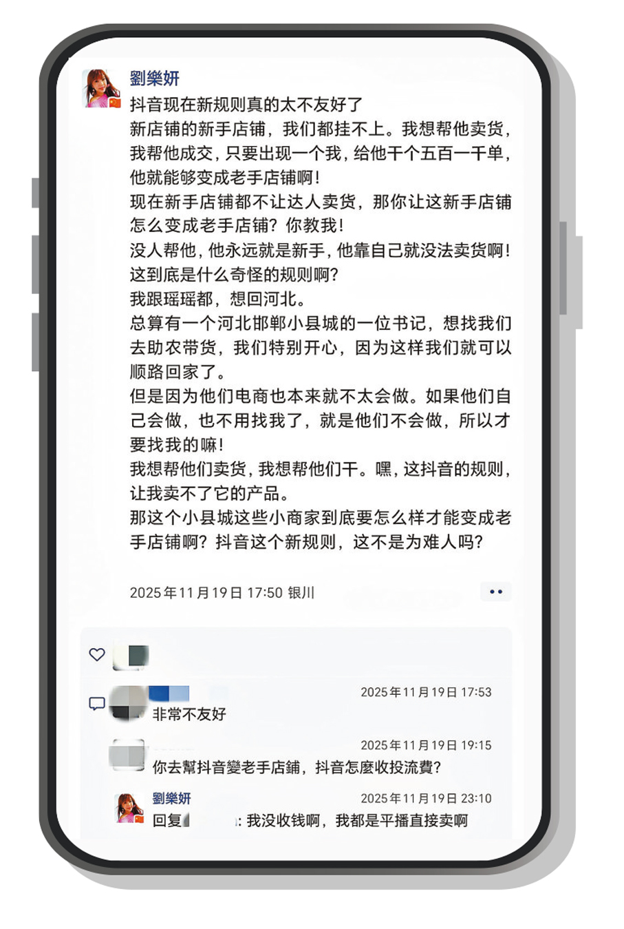 台籍女主播劉樂妍也對香港文匯報新聞調查部說,抖音平台新修改規則,不允許「達人」幫助新店舖帶貨直播,這意味着新店舖若想獲得流量傾斜,需通過官方認可方式購買。河北抖音電商從業者劉建超提供的後台數據顯示,其新開賬號9月結算金額23,150元,推流成本17,812元;10月結算25,320元,推流成本19,783元。兩月總流水近4.85萬元,但實際收入每月僅5,000餘元,扣除人員與辦公成本後利潤為負。10月推流費增加1,971元,銷售僅增2,170元,正向利潤僅增199元。