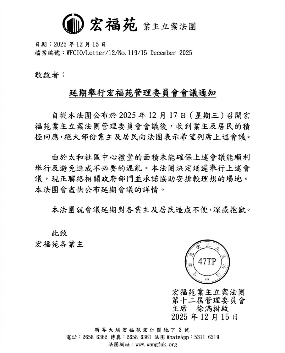 梁先生為宏福苑受影響業主的兒子,他表示法團會議原定今日召開,後突然宣布延期,有關通告僅提及由於大部分業主及居民希望列席會議,惟借用的太和社區中心禮堂面積不足,故延期舉行,由相關政府部門協助安排理想場地。