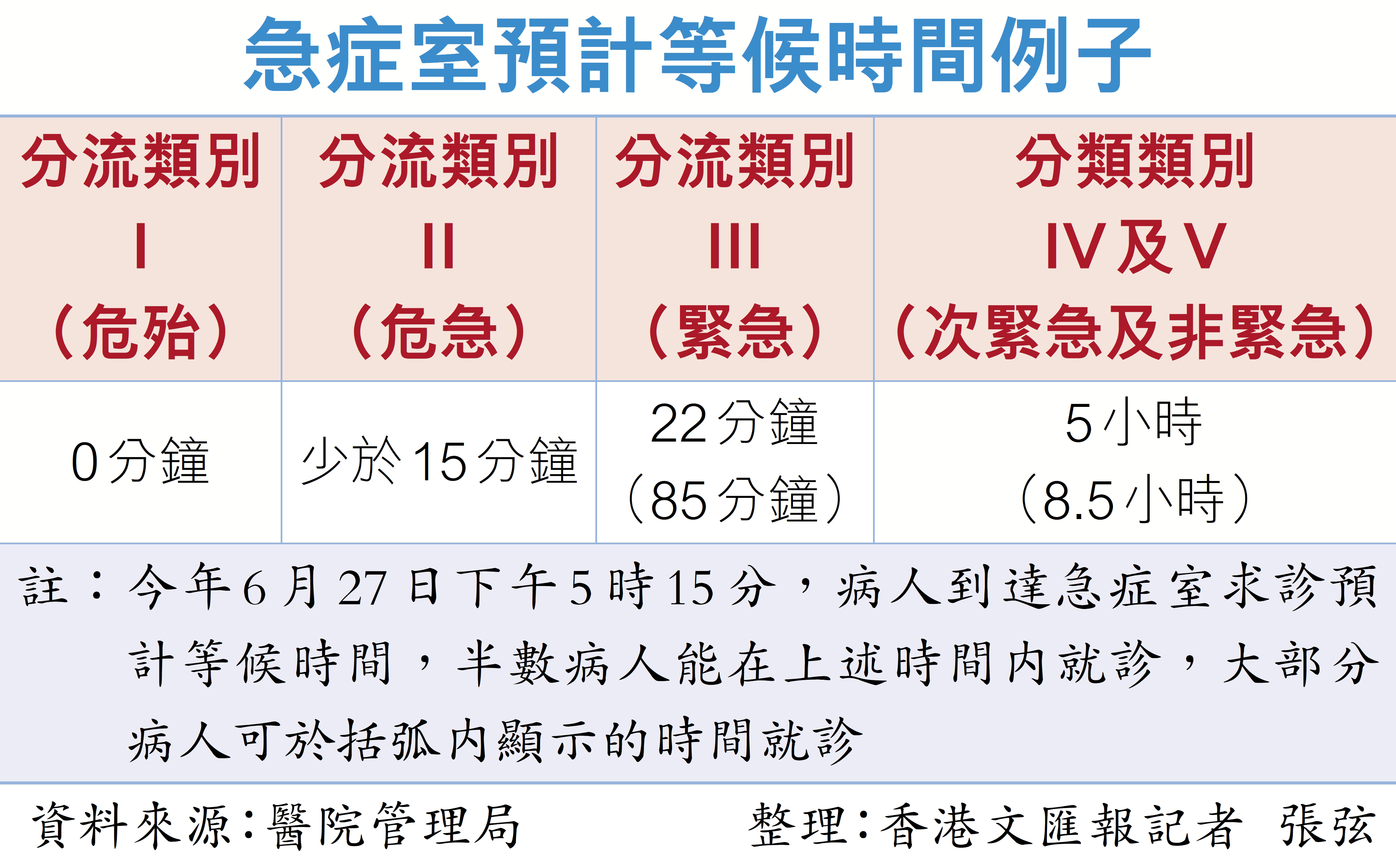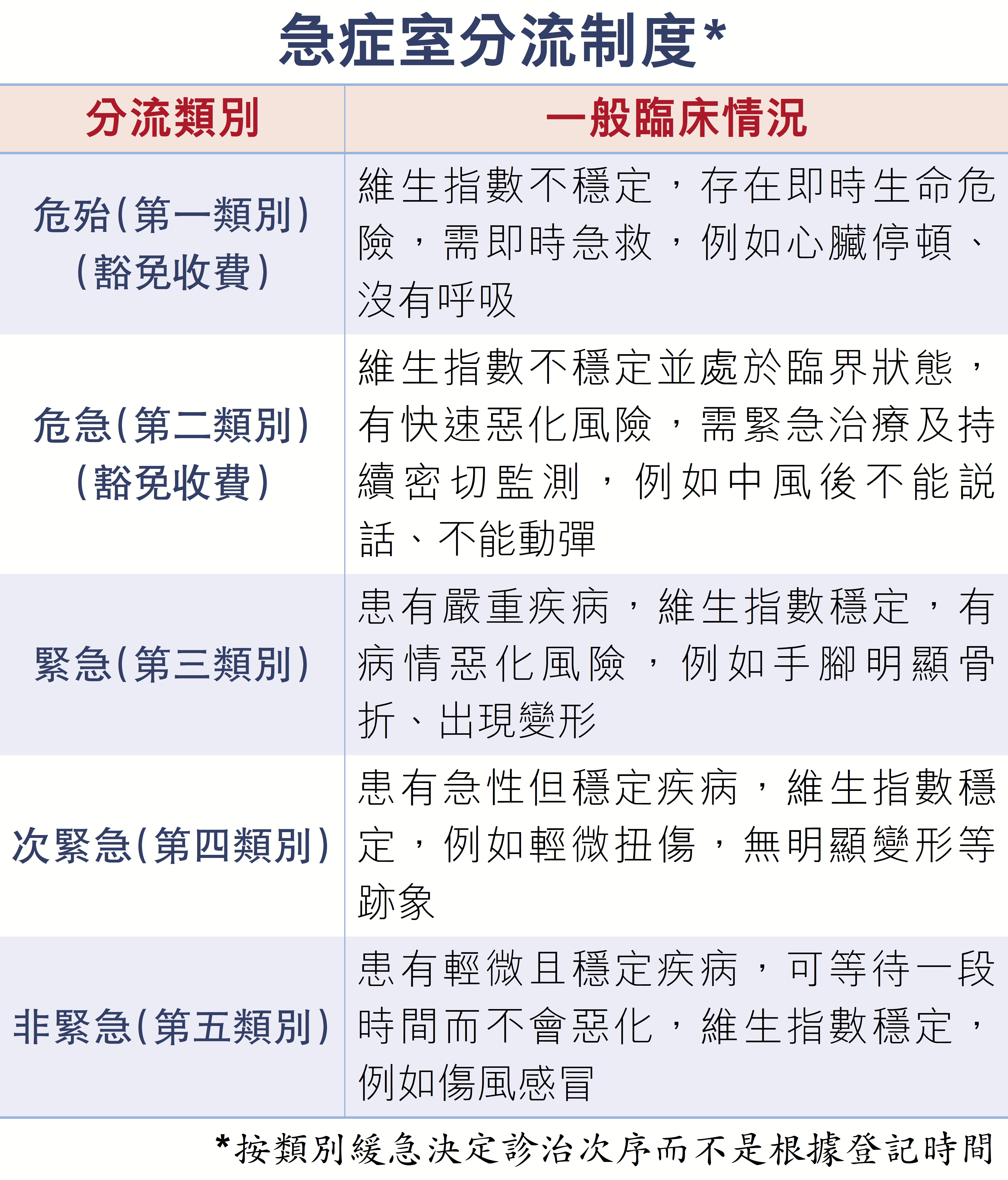 他強調,急症室的核心職能是提供救急服務,為有緊急醫療需求的病人提供最合適治療,故今次調整收費主要目的是理順急症室服務,讓急症室的人手和資源更聚焦照顧病情緊急的病人,因此,新收費機制下「危殆」和「危急」類別病人獲豁免繳納400元診金,而屬「緊急」、「次緊急」和「非緊急」類別的病人則需支付400元診金。