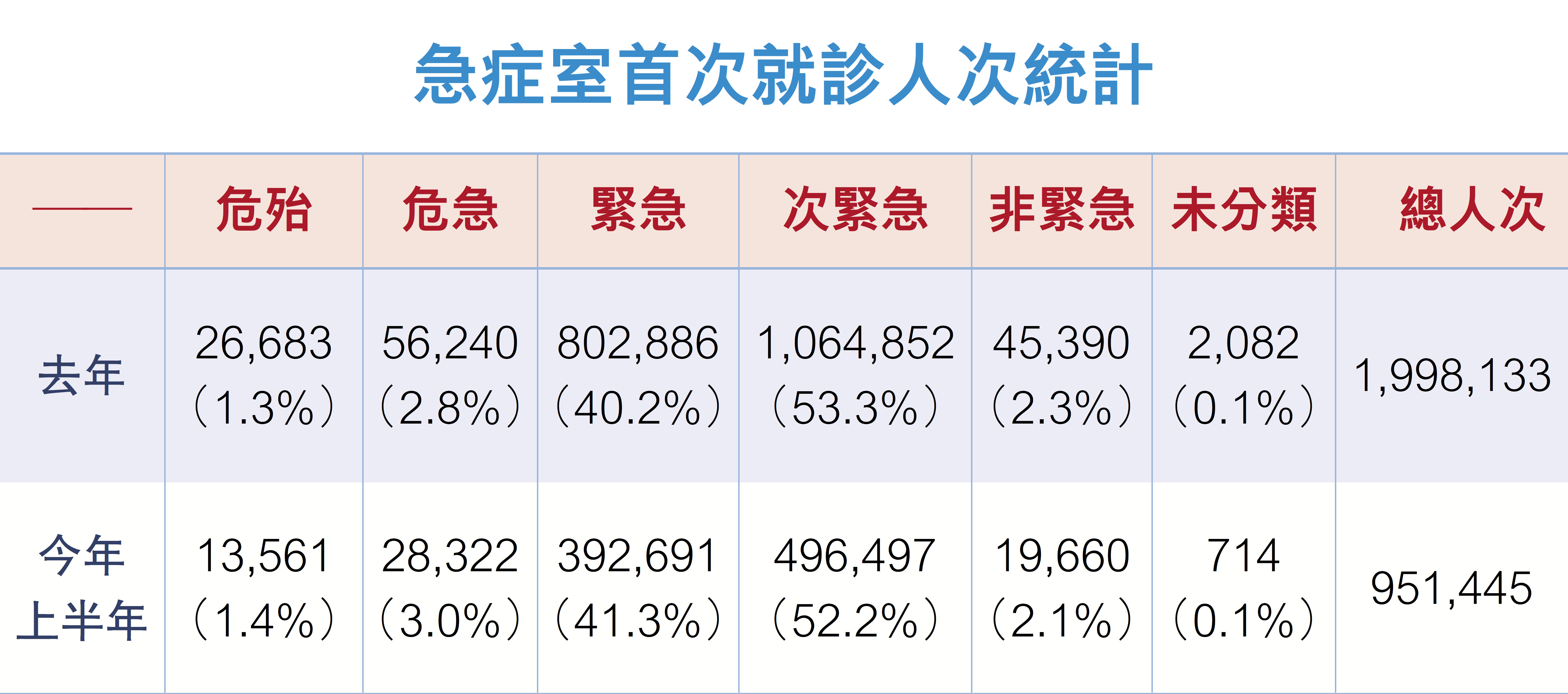 袁卓斌昨日在記者會上表示,急症室服務面臨挑戰,首先是病情穩定的「次緊急」及患有輕微疾病的「非緊急」個案,過往的比例高企,佔用原本應用於處理更緊急個案的醫療資源。根據去年與今年上半年數據,「次緊急」及「非緊急」病人合共比例維持在約55%左右,即過半資源用於這兩類別病人身上;其次面臨的挑戰則是診治程序日益精細複雜,人口老齡化、慢性病引起的相關急性併發症日趨常見,以及醫護人手流失。
