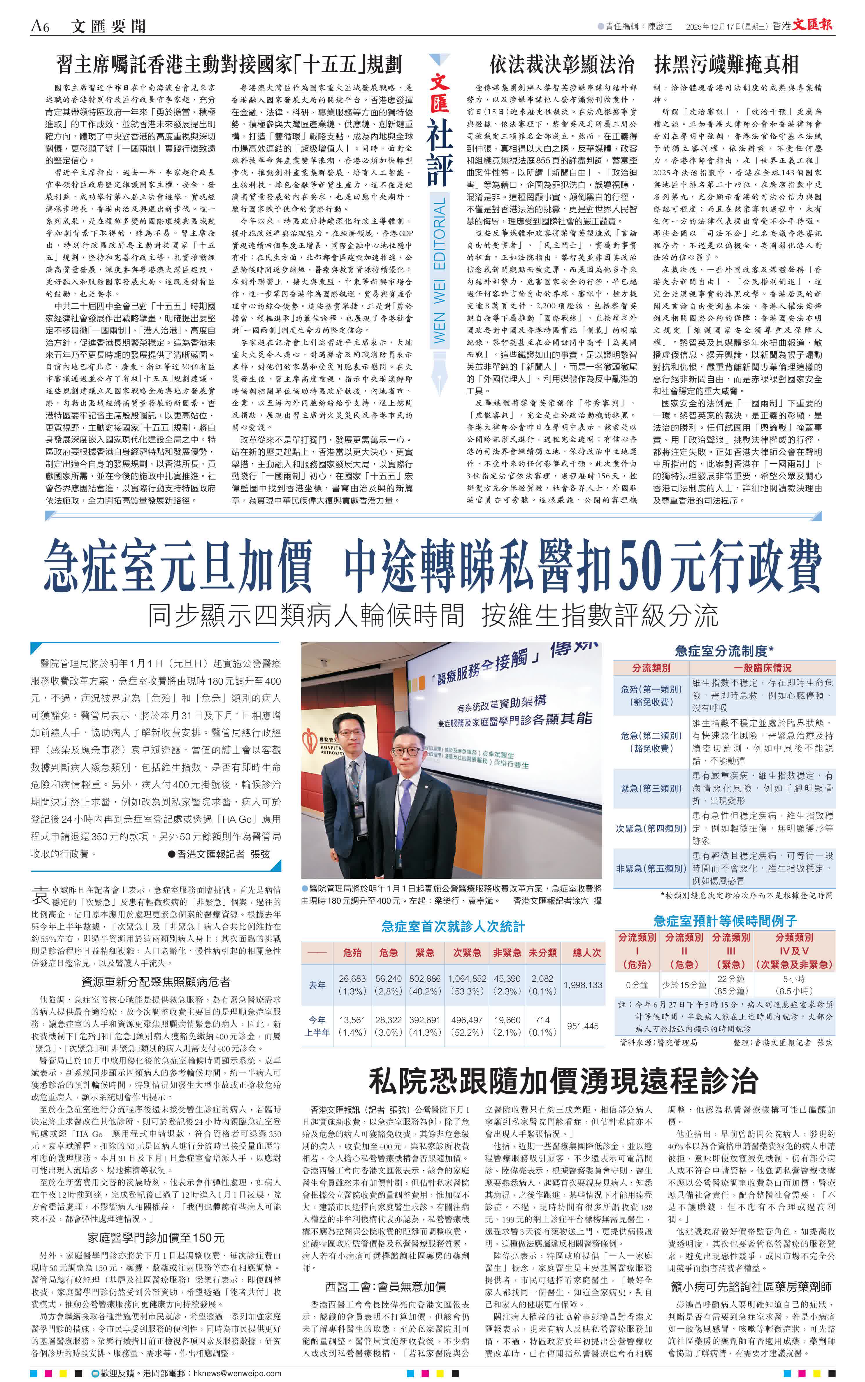 (香港文匯報記者 張弦)醫院管理局將於明年1月1日(元旦日)起實施公營醫療服務收費改革方案,急症室收費將由現時180元調升至400元,不過,病況被界定為「危殆」和「危急」類別的病人可獲豁免。醫管局表示,將於本月31日及下月1日相應增加前線人手,協助病人了解新收費安排。醫管局總行政經理(感染及應急事務)袁卓斌透露,當值的護士會以客觀數據判斷病人緩急類別,包括維生指數、是否有即時生命危險和病情輕重。另外,病人付400元掛號後,輪候診治期間決定終止求醫,例如改為到私家醫院求醫,病人可於登記後24小時內再到急症室登記處或透過「HA Go」應用程式申請退還350元的款項,另外50元餘額則作為醫管局收取的行政費。