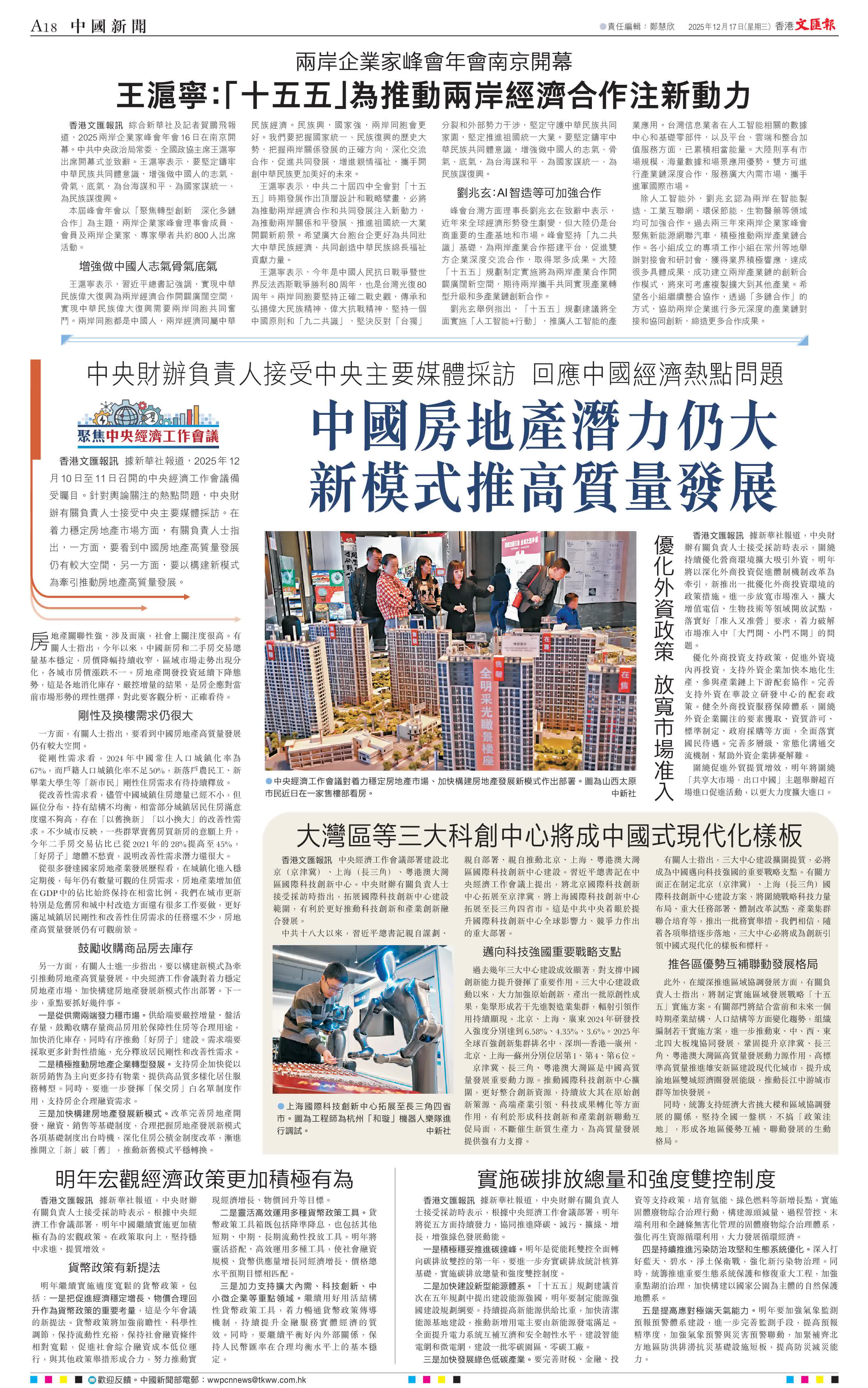 香港文匯報訊 據新華社報道,2025年12月10日至11日召開的中央經濟工作會議備受矚目。針對輿論關注的熱點問題,中央財辦有關負責人士接受中央主要媒體採訪。在着力穩定房地產市場方面,有關負責人士指出,一方面,要看到中國房地產高質量發展仍有較大空間,另一方面,要以構建新模式為牽引推動房地產高質量發展。