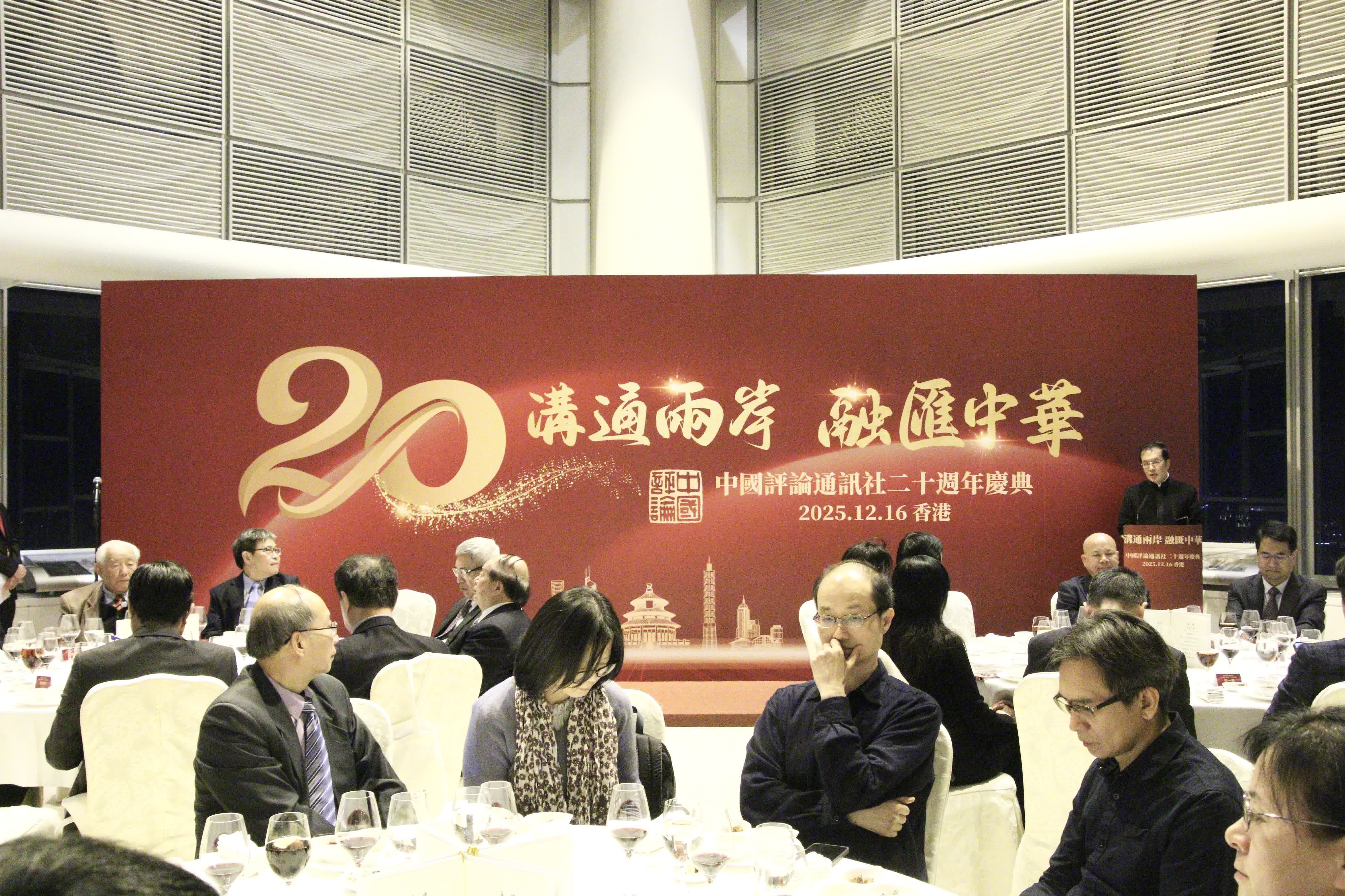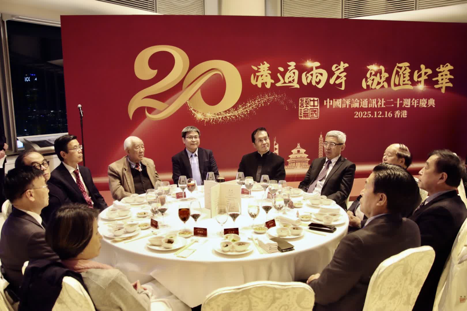 慶祝中評社成立20周年晚宴16日晚在香港中銀大廈70樓會議廳舉行。來自海峽兩岸和港澳的知名人士、專家學者、傳媒高層及中評同仁60餘人齊聚一堂,共同回顧中評社成立20年來的光輝歷程,並展望中評社的發展機遇與美好前景。