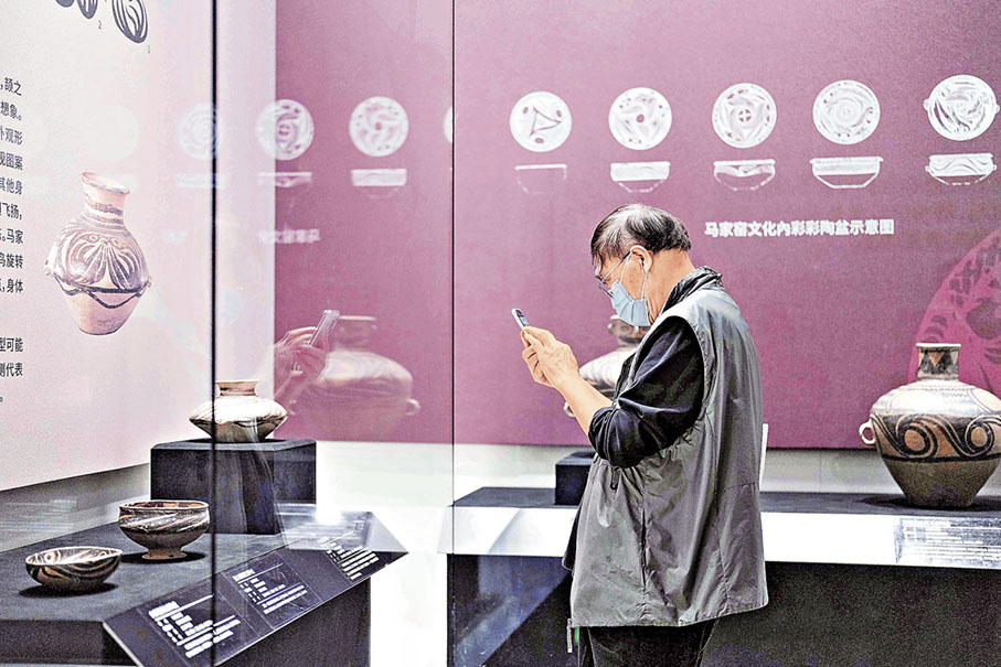 馬家窯文化歷經千年,其彩陶不僅數量巨大,且紋飾華美精緻、繁縟多變,藝術風格絢麗典雅,被譽為世界彩陶藝術之冠。該展共分四個單元。「彩韻悠長」單元聚焦馬家窯文化彩陶的發現歷程、歷史脈絡及農業根基。通過圖文展板詳細介紹馬家窯文化彩陶的發現過程,以時間軸的形式清晰呈現馬家窯文化彩陶的歷史發展脈絡,從馬家窯、半山到馬廠類型的各個階段;「彩陶之巔」單元着重展現馬家窯文化彩陶在紋飾、造型方面的藝術風格,讓觀眾品味彩陶藝術的獨特魅力。通過不同造型的彩陶文物,如瓶、罐、盆、碗等,展示其豐富多樣的器型設計。此外,還展示紋飾精美的彩陶,包括水波紋、幾何紋、動物紋等,分析不同紋飾的寓意與文化內涵;「器以載道」單元深入探析彩陶如何超越實用功能,成為承載先民宇宙觀、生命觀與信仰的精神容器。通過分析馬家窯文化彩陶的紋飾符號、器型功能和製作工藝,解讀其如何展現中國史前先民思想;「影響深遠」單元追溯馬家窯文化彩陶對周邊區域乃至中亞、東歐的輻射及其深遠影響,彰顯中華早期文明對世界文明的貢獻。