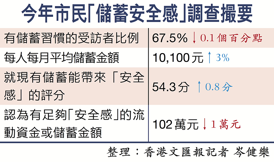 同時,今年港人就現有儲蓄能帶來「安全感」的評分,由去年的53.5分,升至今年的54.3分,創近四年以來最高。今年的港人認為平均需要擁有102萬元儲蓄或流動資金,才有足夠「安全感」。