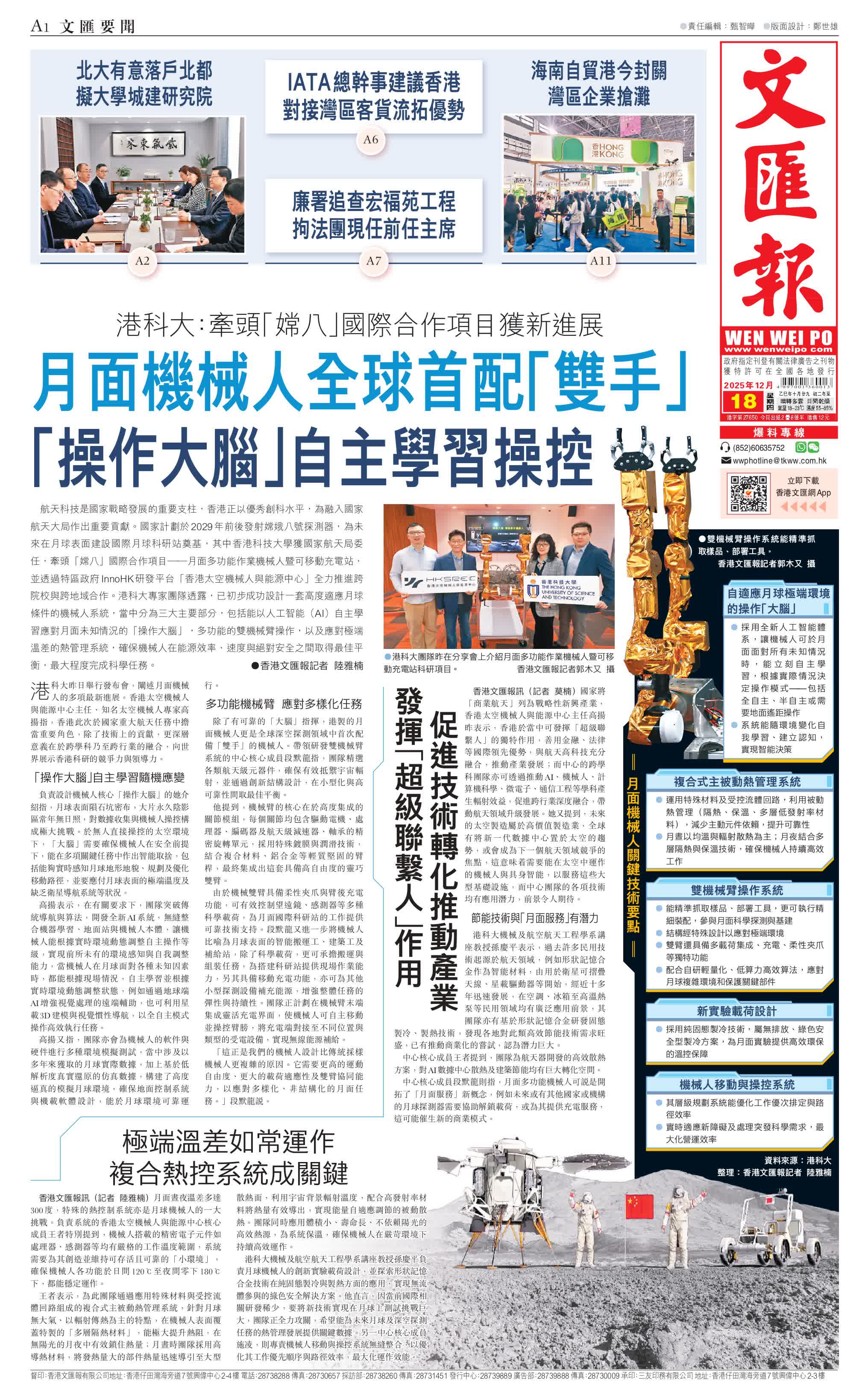 香港文匯報訊(記者 陸雅楠)航天科技是國家戰略發展的重要支柱,香港正以優秀創科水平,為融入國家航天大局作出重要貢獻。國家計劃於2029年前後發射嫦娥八號探測器,為未來在月球表面建設國際月球科研站奠基,其中香港科技大學獲國家航天局委任,牽頭「嫦八」國際合作項目——月面多功能作業機械人暨可移動充電站,並透過特區政府InnoHK研發平台「香港太空機械人與能源中心」全力推進跨院校與跨地域合作。港科大專家團隊透露,已初步成功設計一套高度適應月球條件的機械人系統,當中分為三大主要部分,包括能以人工智能(AI)自主學習應對月面未知情況的「操作大腦」,多功能的雙機械臂操作,以及應對極端溫差的熱管理系統,確保機械人在能源效率、速度與絕對安全之間取得最佳平衡,最大程度完成科學任務。
